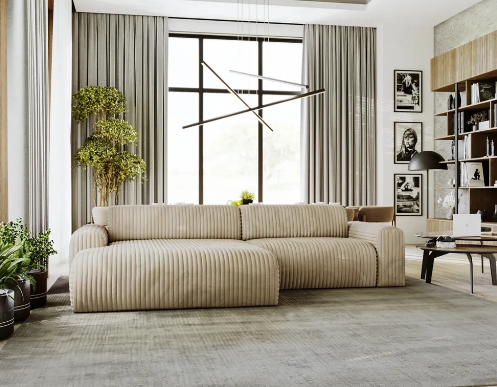 - Nowoczesny narożnik sztruksowy do salonu SEFO. Narożnik zaskoczy Cię wyjątkowym designem oraz wysokim komfortem. W siedzisku zastosowano piankę odporną na odkształcenia oraz sprężyny faliste. Narożnik obity futrową tkaniną Vito.