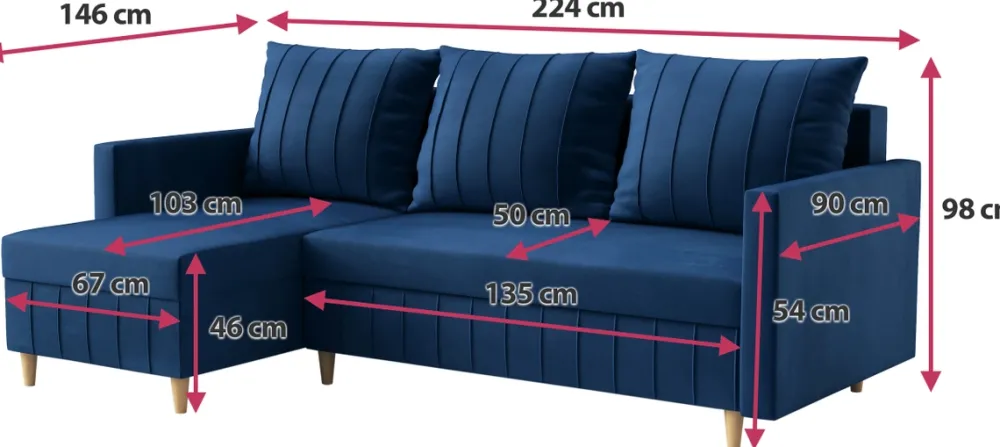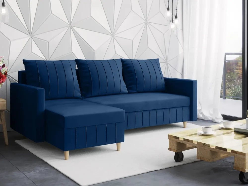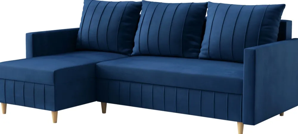 Montaż narożnika jest intuicyjny i szybki, dzięki czemu oszczędzasz czas i energię. Trzy duże poduchy zadbają o odpowiednie podparcie dla pleców podczas odpoczynku. Natomiast wysokie drewniane nóżki nie tylko stabilizują mebel, ale także podkreślają jego nowoczesny design oraz ułatwiają sprzątanie pod nim.