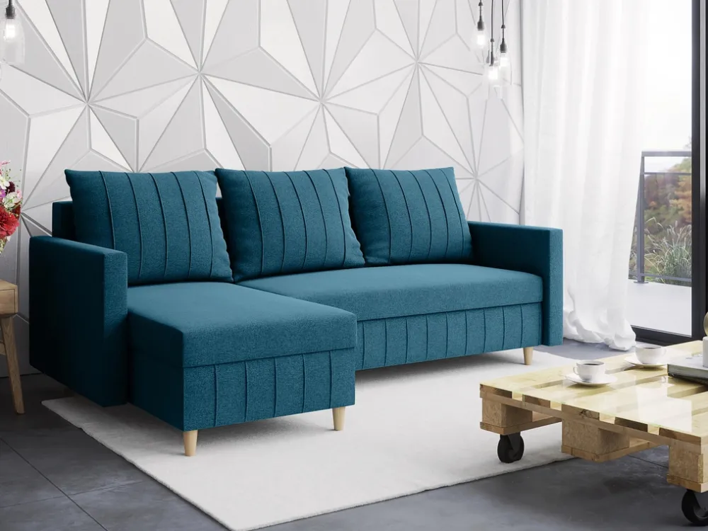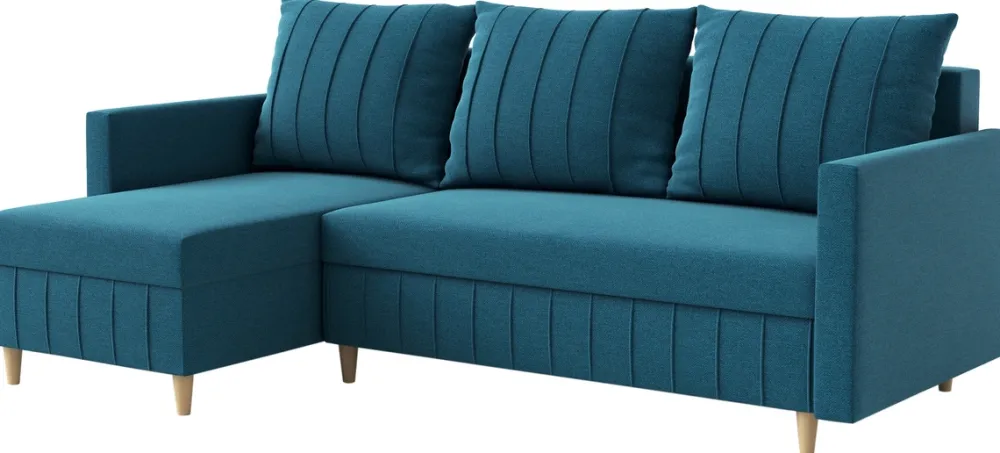 Montaż narożnika jest intuicyjny i szybki, dzięki czemu oszczędzasz czas i energię. Trzy duże poduchy zadbają o odpowiednie podparcie dla pleców podczas odpoczynku. Natomiast wysokie drewniane nóżki nie tylko stabilizują mebel, ale także podkreślają jego nowoczesny design oraz ułatwiają sprzątanie pod nim.