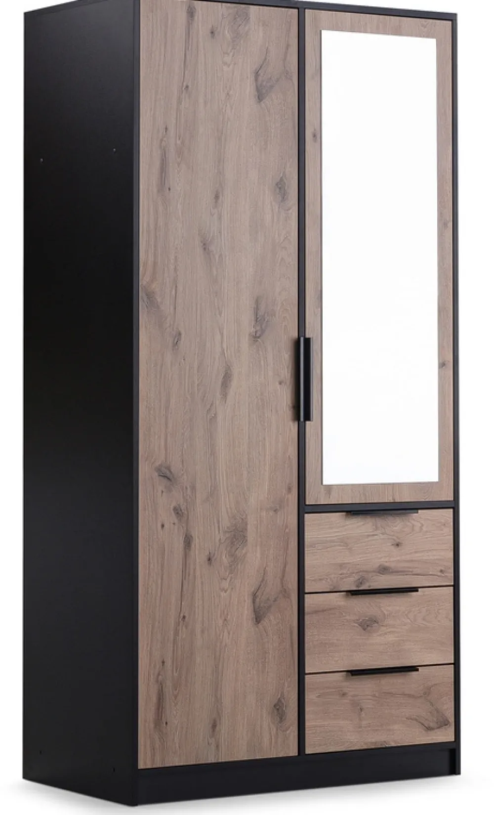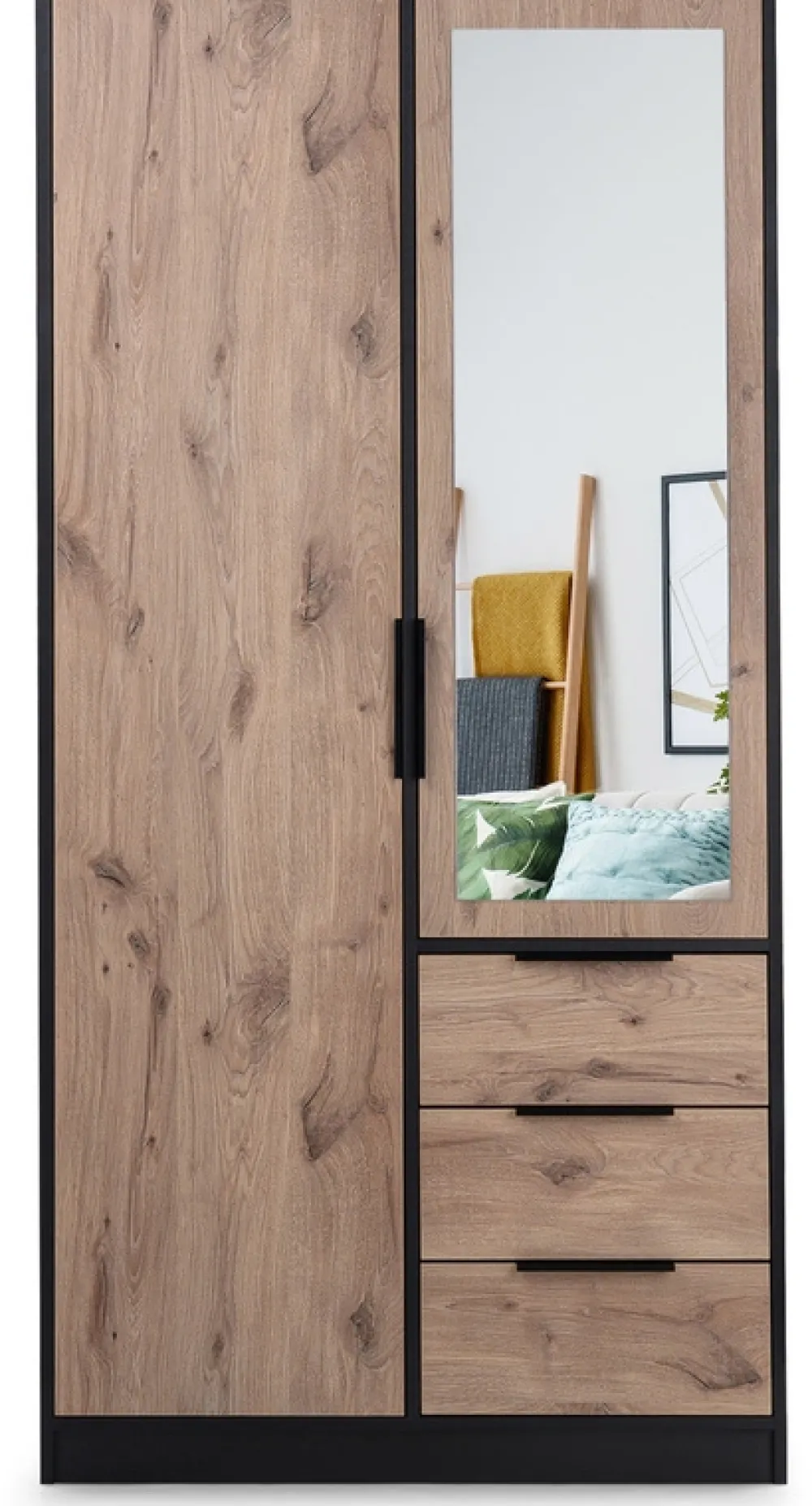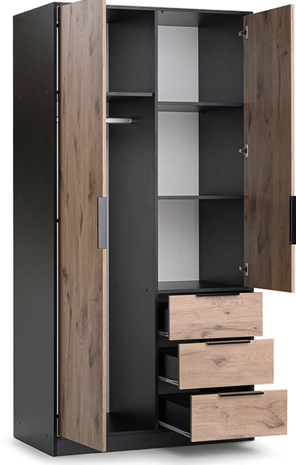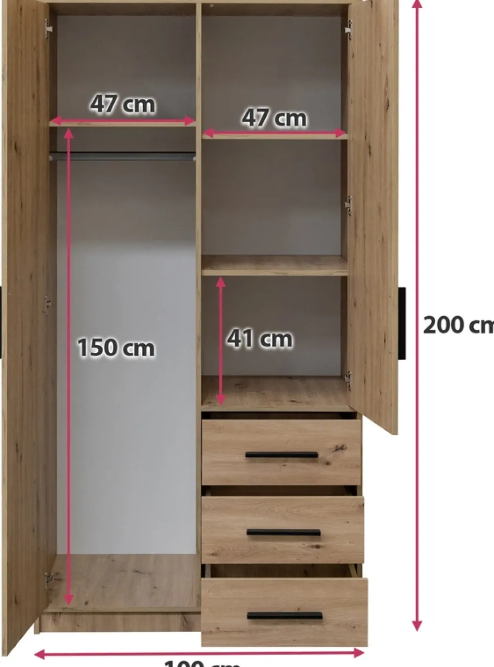 - Dwudrzwiowa szafa uchylna 100 cm LANTE posiada półkę i drążek na wieszaki za lewymi drzwiami oraz trzy półki za drzwiami z lustrem po prawej stronie. U dołu swoje miejsce znalazły trzy pojemne szuflady osadzone na prowadnicach rolkowych.