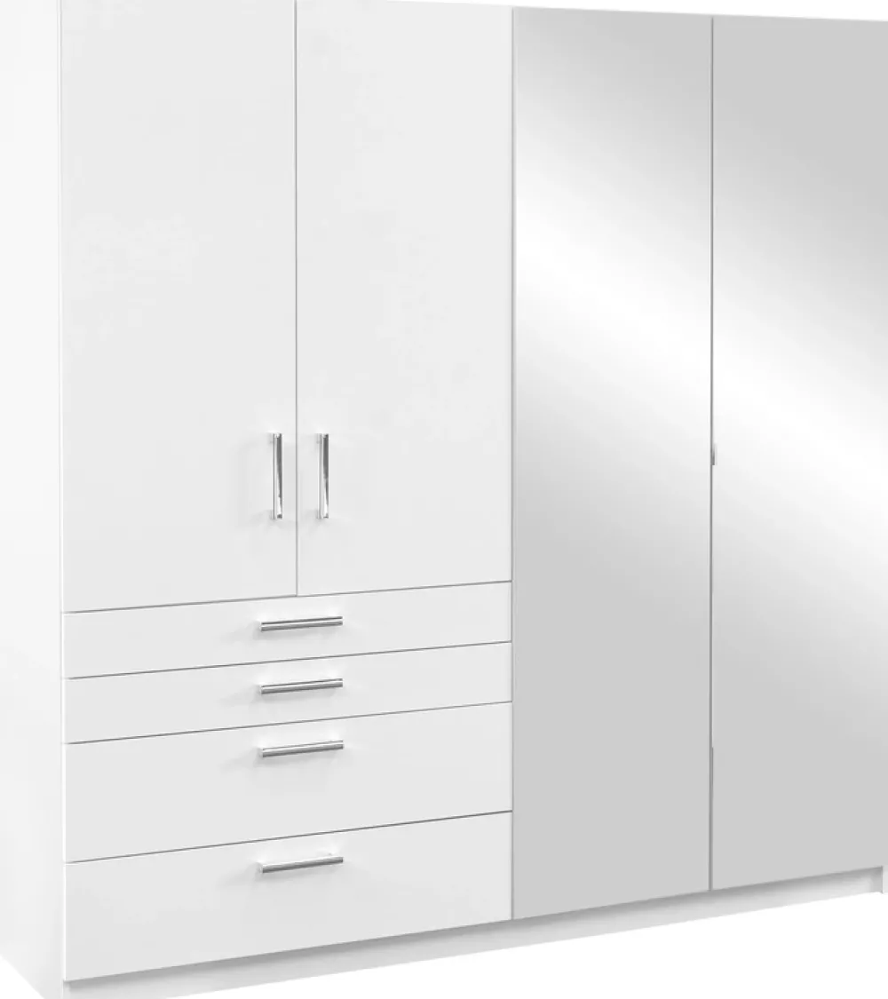 - Szafa z lustrem 200 cm POLAR posiada parę drzwi po lewej stronie, za którymi znajduje się aluminiowy drążek na wieszaki. Pod drzwiami znajdują się cztery głębokie szuflady. Po prawej stronie szafy swoje miejsce znalazły drzwi z lustrem.