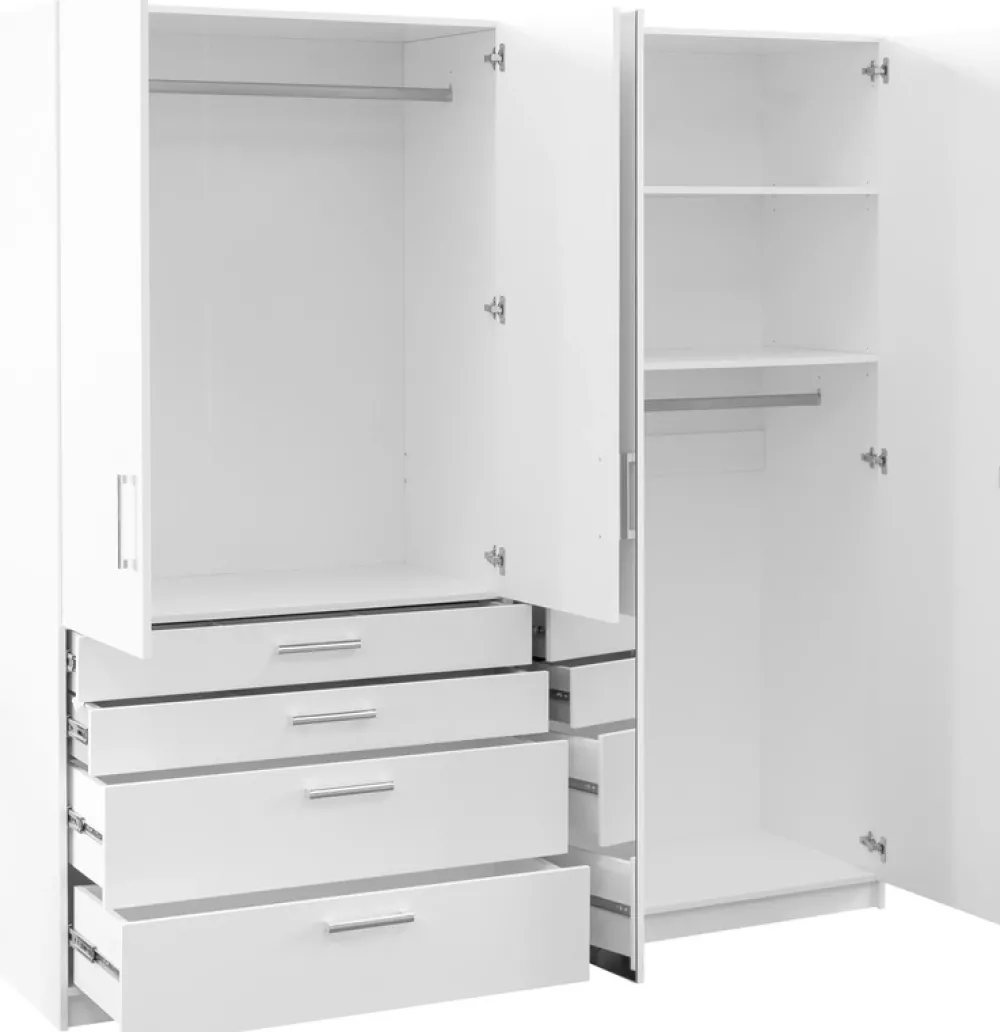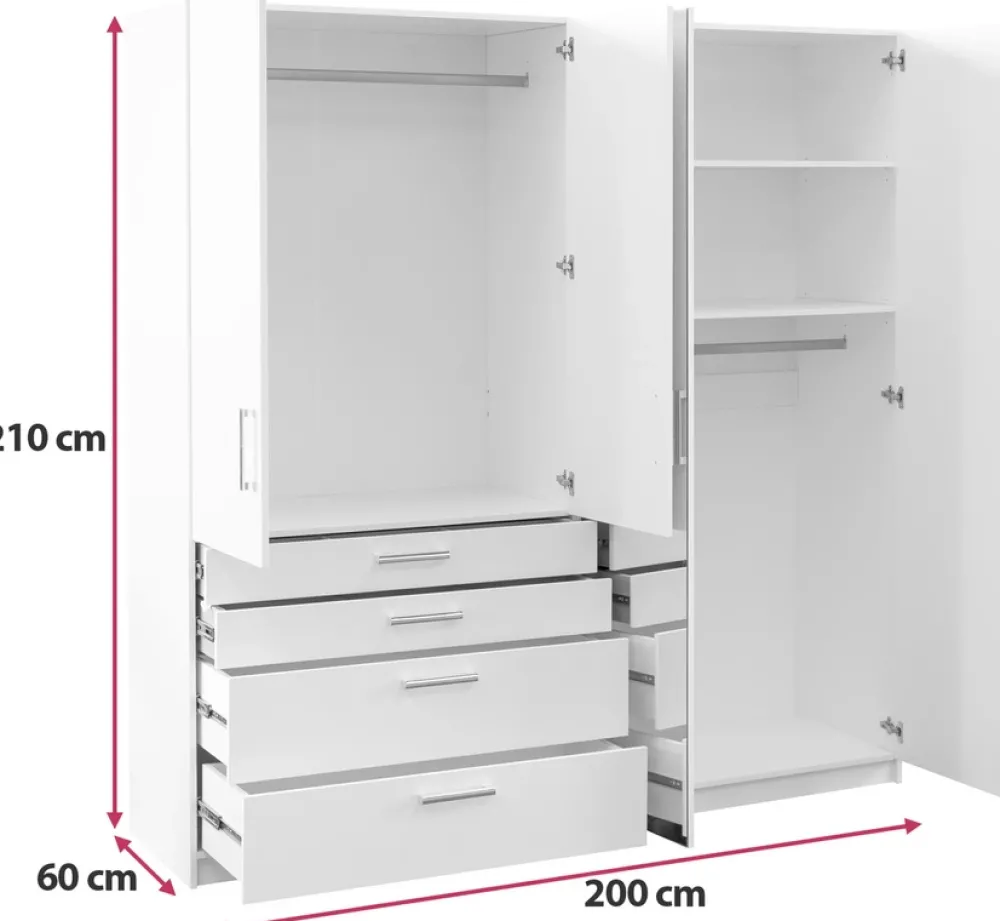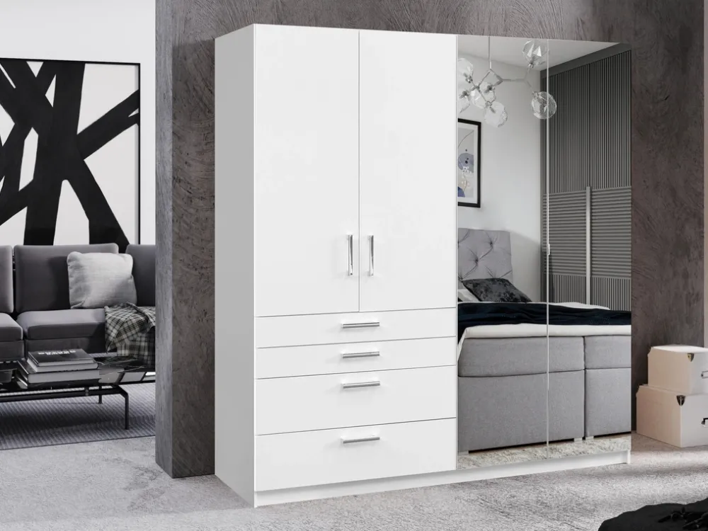 Po lewej stronie szafy znajduje się para drzwi, za którymi ukryty jest drążek na wieszaki. To idealne miejsce na przechowywanie ubrań, które wymagają odpowiedniego powieszenia, takich jak płaszcze, sukienki czy koszule. Pod drzwiami umieszczono cztery przestronne szuflady, które doskonale sprawdzą się do organizacji drobniejszych rzeczy, jak bielizna czy dodatki.