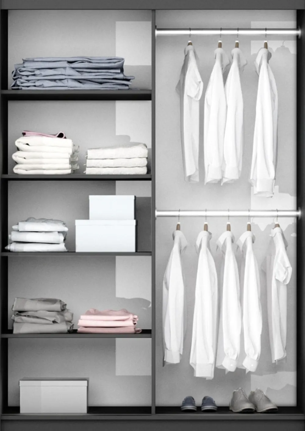 Po prawej stronie szafy umieszczono dwa metalowe drążki na wieszaki, które zapewniają odpowiednią przestrzeń na odzież wiszącą, taką jak marynarki, płaszcze czy sukienki. Dzięki dwóm drążkom ubrania pozostają w idealnym stanie, bez zagnieceń, co pozwala na ich wygodne przechowywanie i szybki dostęp.