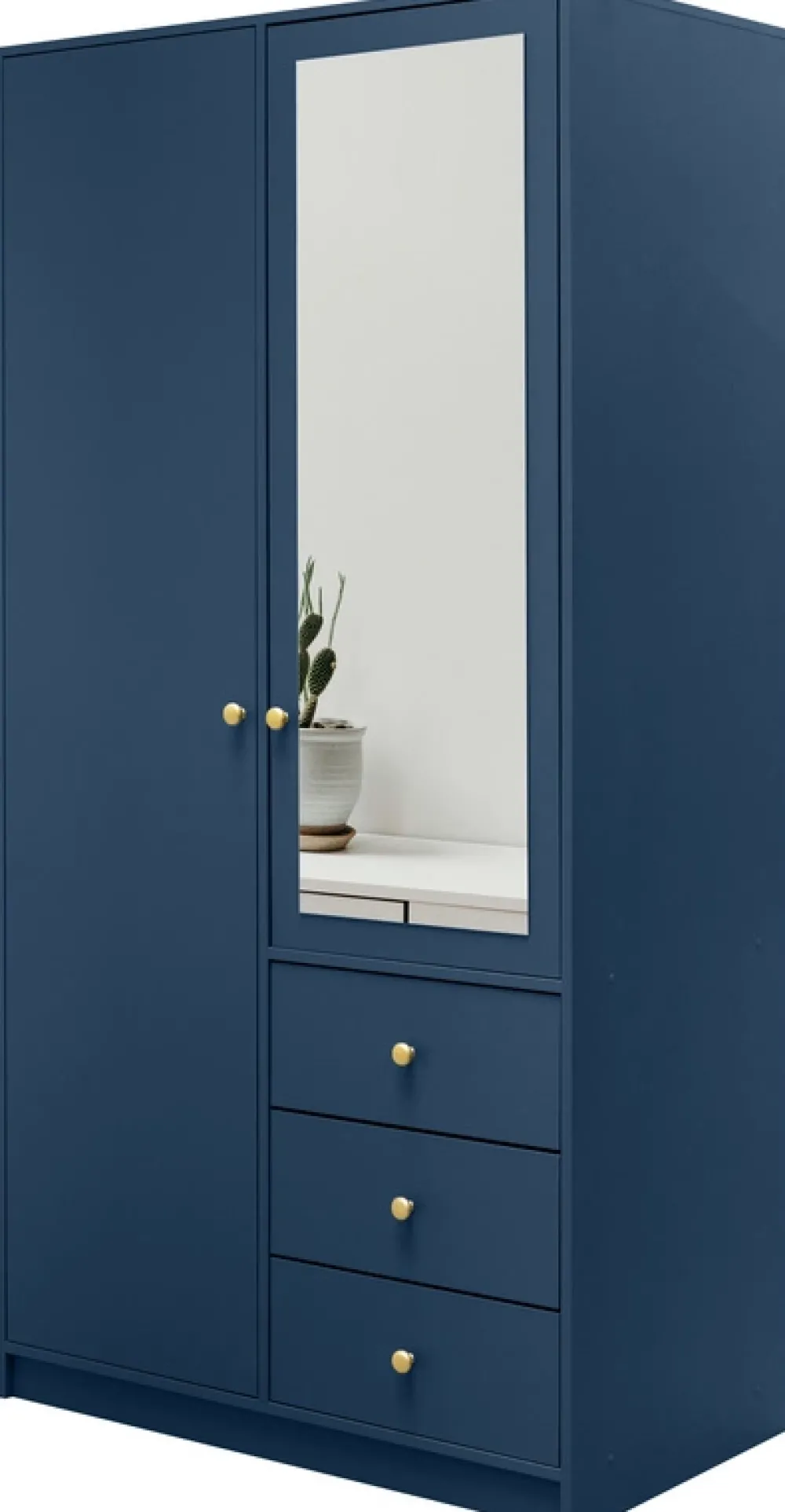 Pod drzwiami z lustrem znajdują się trzy pojemne szuflady, które zapewniają dodatkową przestrzeń do przechowywania mniejszych przedmiotów, takich jak bielizna, akcesoria czy dokumenty. Dzięki prowadnicom rolkowym szuflady otwierają się płynnie i cicho, co podnosi komfort użytkowania.