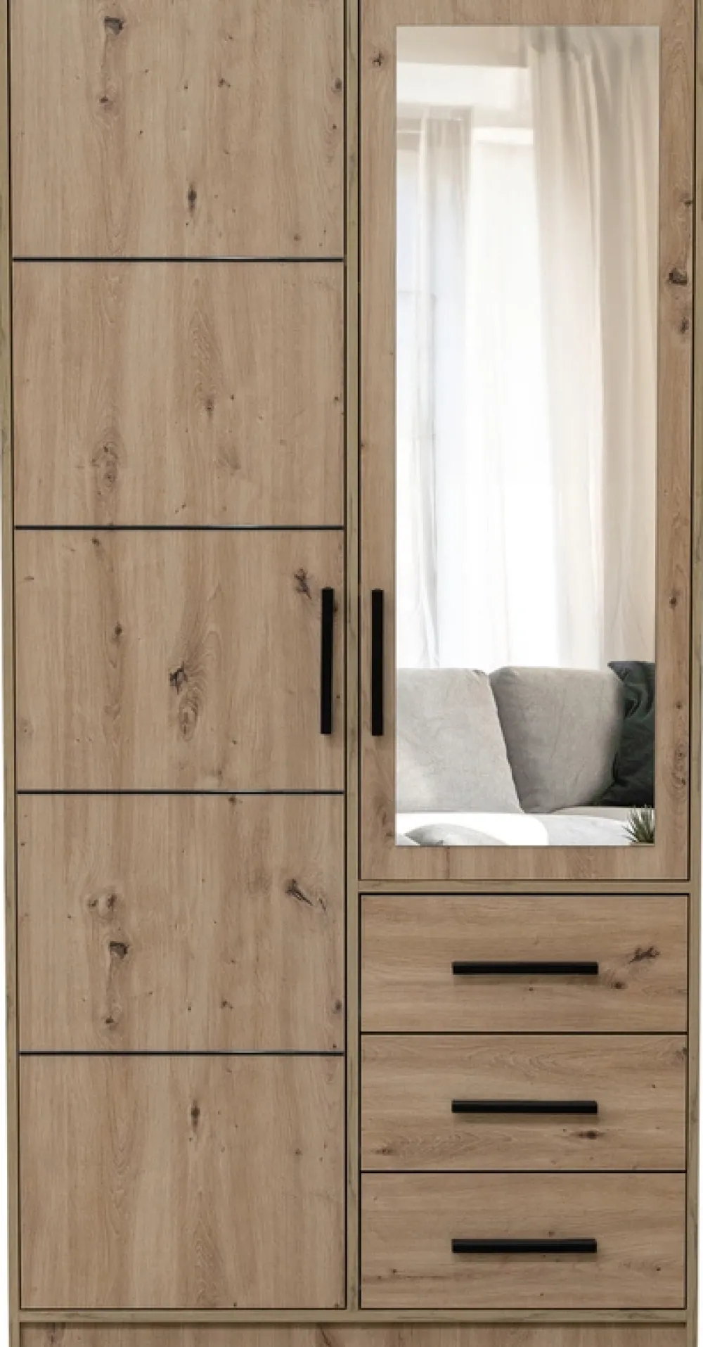- Dwudrzwiowa szafa uchylna KODA posiada 100 cm szerokości, za lewymi drzwiami znajduje się półka oraz drążek na wieszaki, natomiast po prawej stronie trzy półki na ubrania i trzy szuflady poniżej. Szafa wykonana z płyty laminowanej w kolorze dąb artisan.
