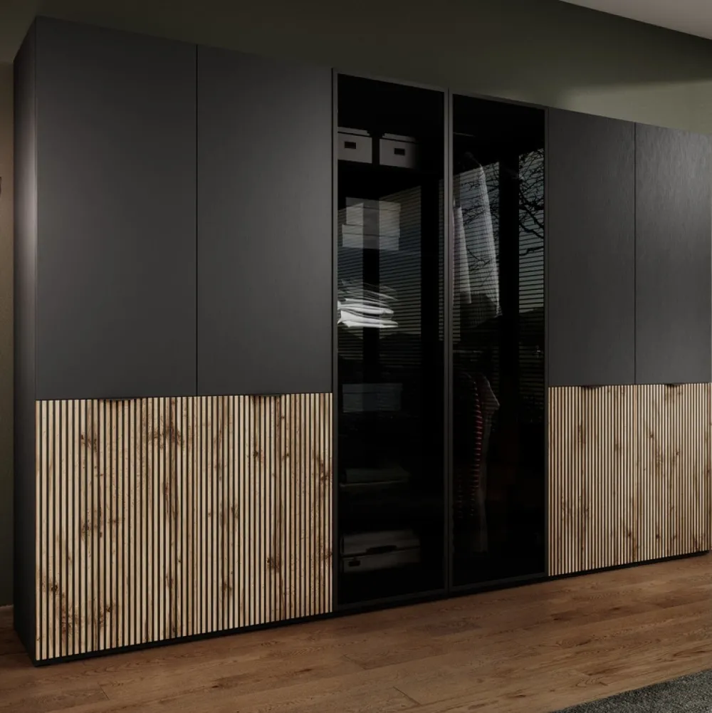 - Zestaw szaf SIGMA 3×101 cm to połączenie czerni, drewna dąb wotan i przeszklenia. 18 półek, 6 drążków, cichy domyk, system push to open i eleganckie wykończenie sprawiają, że to idealna szafa do nowoczesnych i loftowych wnętrz.