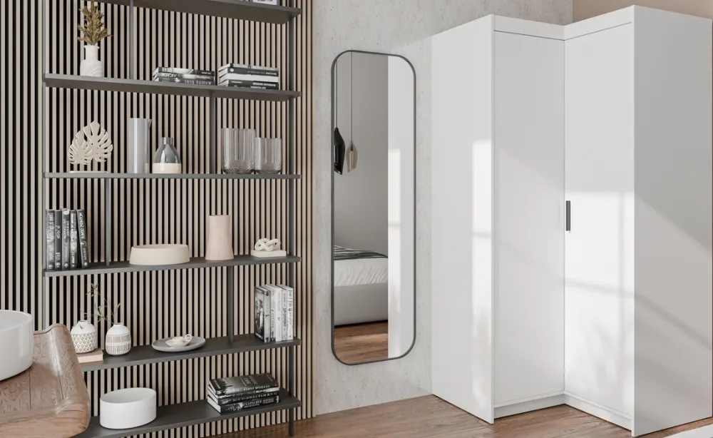 - Kompaktowy wymiar 98 × 98 cm – szafa idealnie dopasowana do narożników pomieszczeń
