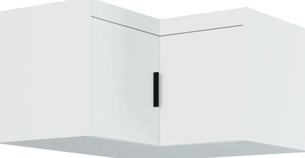 - Zestaw narożny KUBA w kolorze białym to kompaktowe rozwiązanie do małych przestrzeni. Zawiera szafę narożną z półkami i drążkiem oraz nadstawkę z dwoma poziomami przechowywania. Czarne uchwyty i matowe wykończenie podkreślają nowoczesny wygląd mebla