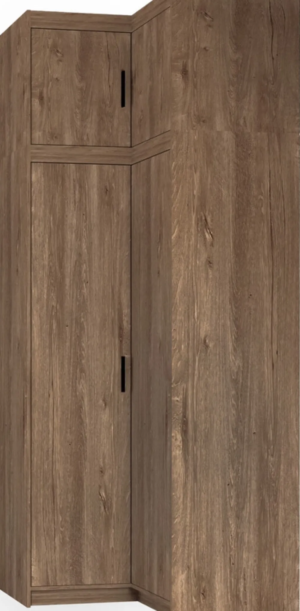 Zestaw narożny KUBA to idealne rozwiązanie dla osób, które chcą w pełni wykorzystać przestrzeń w narożnikach pomieszczeń, zachowując przy tym estetykę i funkcjonalność. W skład kompletu wchodzi dwudrzwiowa szafa narożna oraz dedykowana nadstawka – oba elementy wykończone w ciepłym dekorze dąb lefkas, z nowoczesnymi, czarnymi uchwytami. To doskonała propozycja do sypialni, garderoby czy pokoju młodzieżowego.
