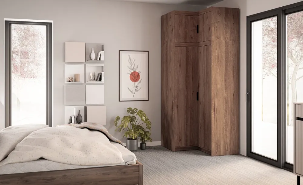 - Kompaktowy wymiar 98 × 98 cm – szafa idealnie dopasowana do narożników pomieszczeń