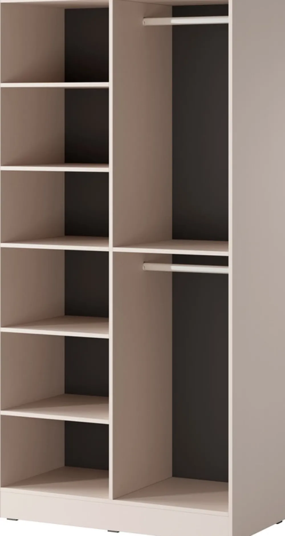 Wnętrze szafy zostało zaprojektowane z myślą o maksymalnej funkcjonalności. Po lewej stronie znajduje się sześć przestronnych półek, idealnych na złożone ubrania, akcesoria czy dodatki. Prawa strona oferuje dwa drążki na wieszaki, które doskonale sprawdzą się do przechowywania koszul, sukienek i płaszczy, a nad nimi umieszczono dodatkową półkę na rzadziej używane przedmioty. Taki układ ułatwia organizację i zapewnia szybki dostęp do wszystkich niezbędnych rzeczy.