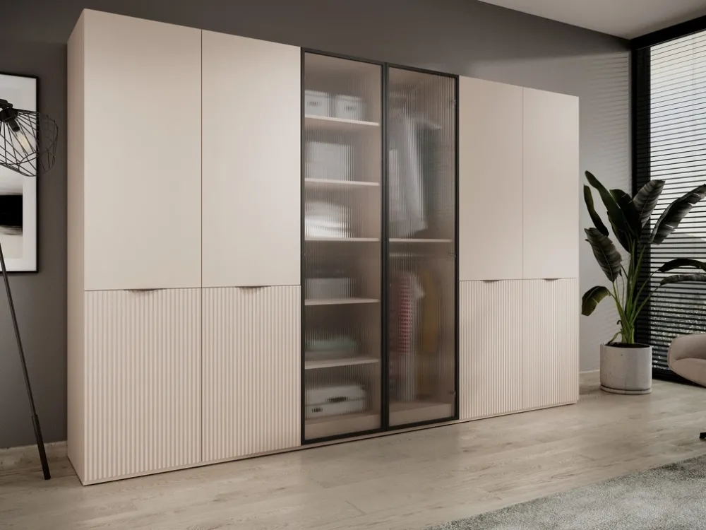 Modułowa szafa SIGMA to idealny wybór dla miłośników nowoczesnego designu i minimalistycznych rozwiązań. Przeszklony front dodaje jej lekkości i elegancji, sprawiając, że wnętrze zyskuje przestronny i stylowy charakter. Transparentne drzwi nadają szafie nowoczesny wygląd, jednocześnie umożliwiając wgląd do wnętrza, co podkreśla piękno przechowywanych ubrań i dodatków.