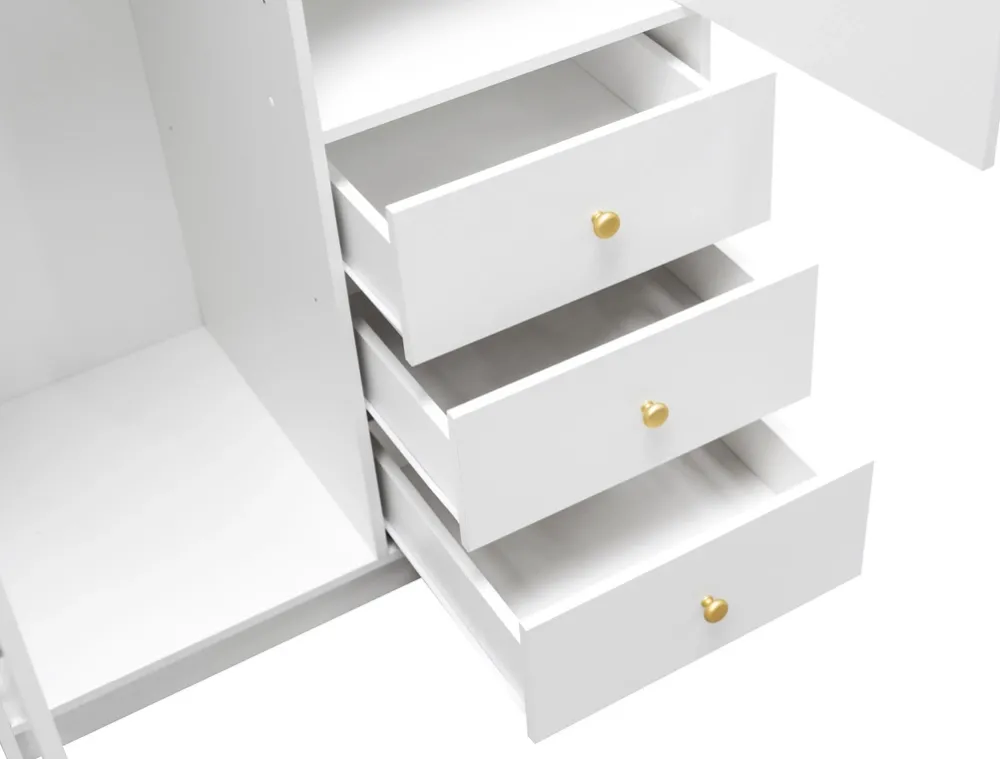 Pod drzwiami z lustrem znajdują się trzy pojemne szuflady, które zapewniają dodatkową przestrzeń do przechowywania mniejszych przedmiotów, takich jak bielizna, akcesoria czy dokumenty. Dzięki prowadnicom rolkowym szuflady otwierają się płynnie i cicho, co podnosi komfort użytkowania.