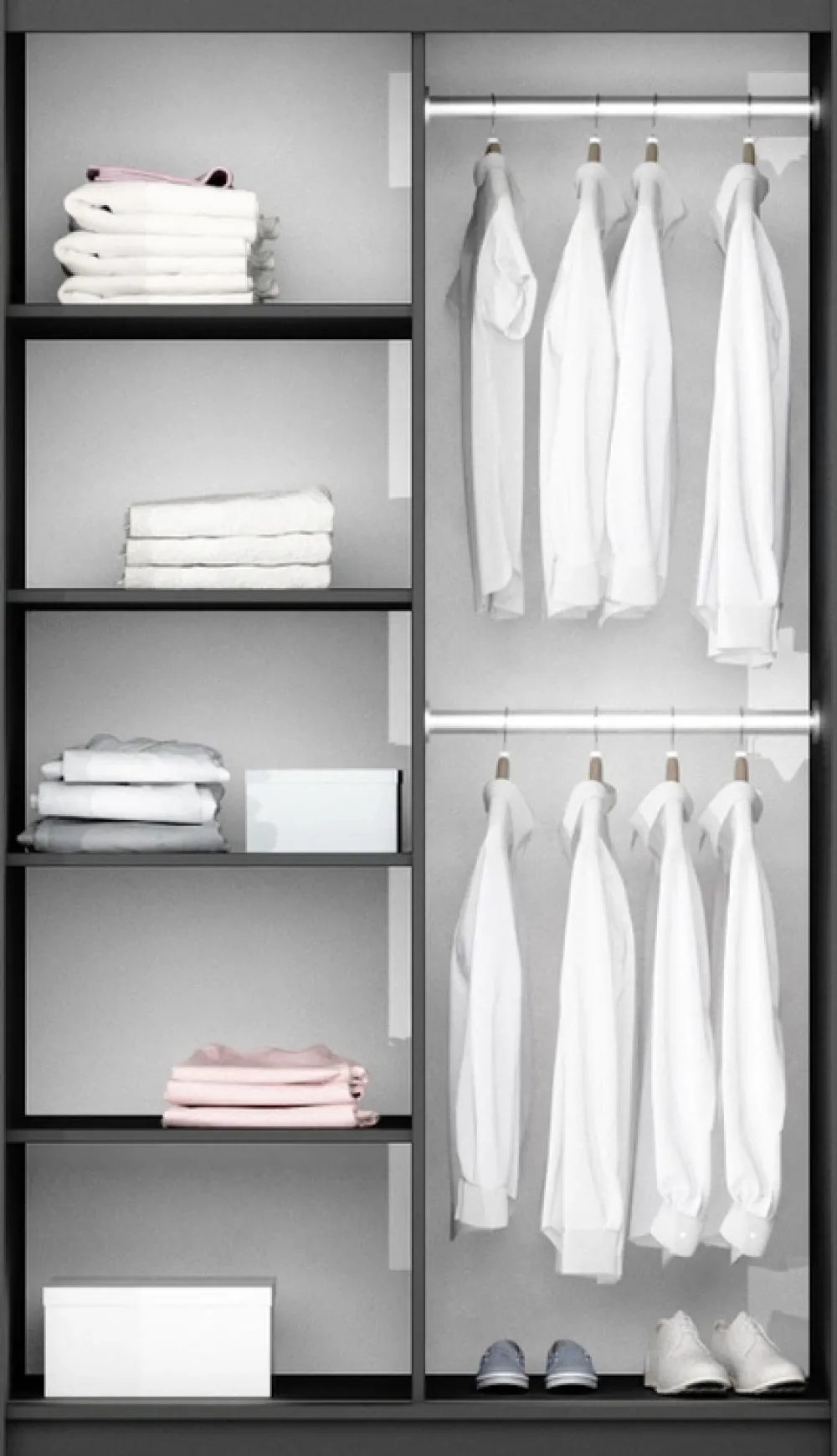 Po prawej stronie szafy umieszczono dwa metalowe drążki na wieszaki, które zapewniają odpowiednią przestrzeń na odzież wiszącą, taką jak marynarki, płaszcze czy sukienki. Dzięki dwóm drążkom ubrania pozostają w idealnym stanie, bez zagnieceń, co pozwala na ich wygodne przechowywanie i szybki dostęp.