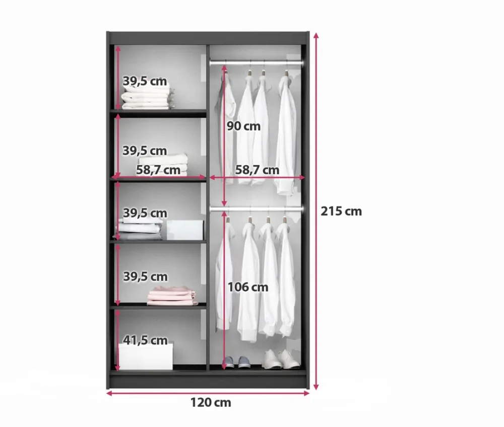 Szafa przesuwna o szerokości 120 cm VASCO to kompaktowe i stylowe rozwiązanie, idealne do każdej sypialni lub przedpokoju. Mimo niewielkich rozmiarów oferuje wyjątkową funkcjonalność i elegancki wygląd, który doskonale wpasuje się w nowoczesne wnętrza, zapewniając jednocześnie wygodną organizację przestrzeni.