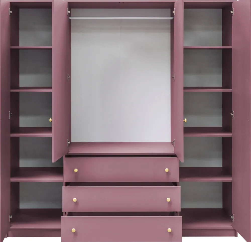 Za drzwiami po lewej i prawej stronie znajduje się po pięć przestronnych półek, które oferują idealne miejsce na złożone ubrania, takie jak swetry, koszulki, ręczniki czy pościel. Taki układ półek pozwala na łatwą organizację i szybki dostęp do potrzebnych rzeczy, utrzymując porządek w garderobie.