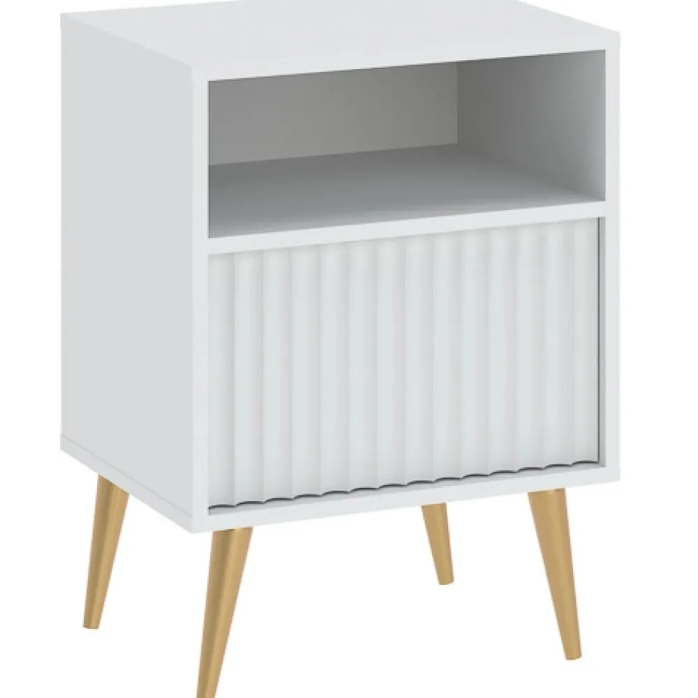 Szafka nocna BELLUNO to idealne dopełnienie nowoczesnej sypialni. Jej kompaktowa forma o wysokości 60,8 cm i szerokości 47,4 cm sprawia, że bez problemu zmieści się obok każdego łóżka. Front z ryflowanego MDF-u w kolorze białym oraz złote metalowe nóżki nadają meblowi elegancki, subtelnie luksusowy charakter. Praktyczna szuflada z systemem „push to open” oraz otwarta półka pozwalają wygodnie przechować wszystko, co chcesz mieć pod ręką – od książek po ładowarki czy kosmetyki.