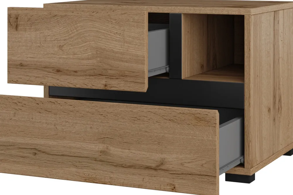 Szafka nocna została zaprojektowana z myślą o codziennym komforcie. Dwie głębokie szuflady pozwalają na zachowanie porządku przy łóżku, a ich rolkowe prowadnice zapewniają lekkość i stabilność ruchu, nawet przy większym obciążeniu. Obrzeża wykończone trwałą okleiną ABS zwiększają odporność mebla na uszkodzenia, chroniąc go przed zarysowaniami i wilgocią.
