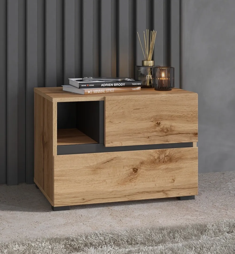 Ta kompaktowa i stylowa szafka nocna to idealne rozwiązanie dla osób ceniących funkcjonalność i estetykę. Dzięki dwu pojemnym szufladom z łatwością uporządkujesz najpotrzebniejsze drobiazgi, które chcesz mieć zawsze pod ręką – od książek i ładowarek po kosmetyki i notatnik.