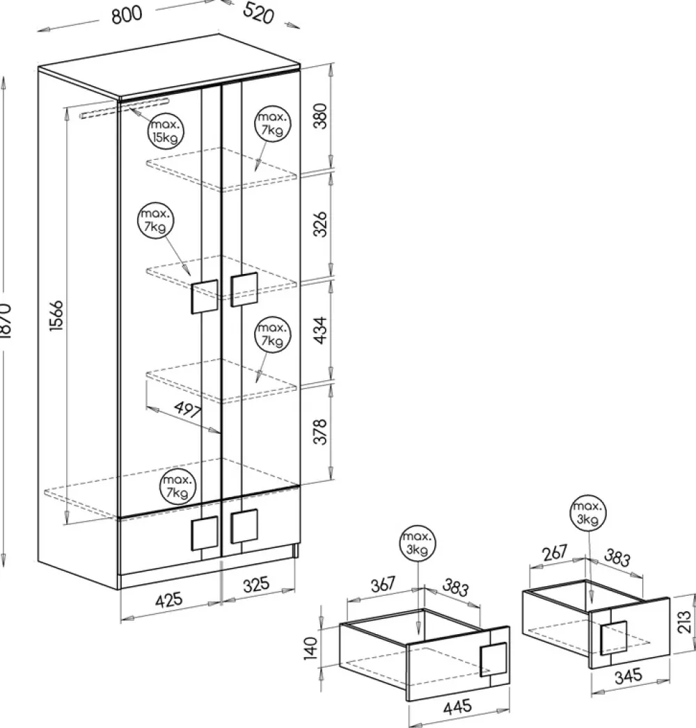 Szafa ma wymiary idealnie wpasowujące się w potrzeby współczesnych wnętrz. Konstrukcja z płyty laminowanej o grubości 16 mm gwarantuje trwałość i stabilność, zapewniając jednocześnie lekkość i łatwość w montażu. Dzięki przemyślanym proporcjom szafa nie przytłacza przestrzeni, pozostając jednocześnie funkcjonalnym i pojemnym elementem wyposażenia każdego pomieszczenia.