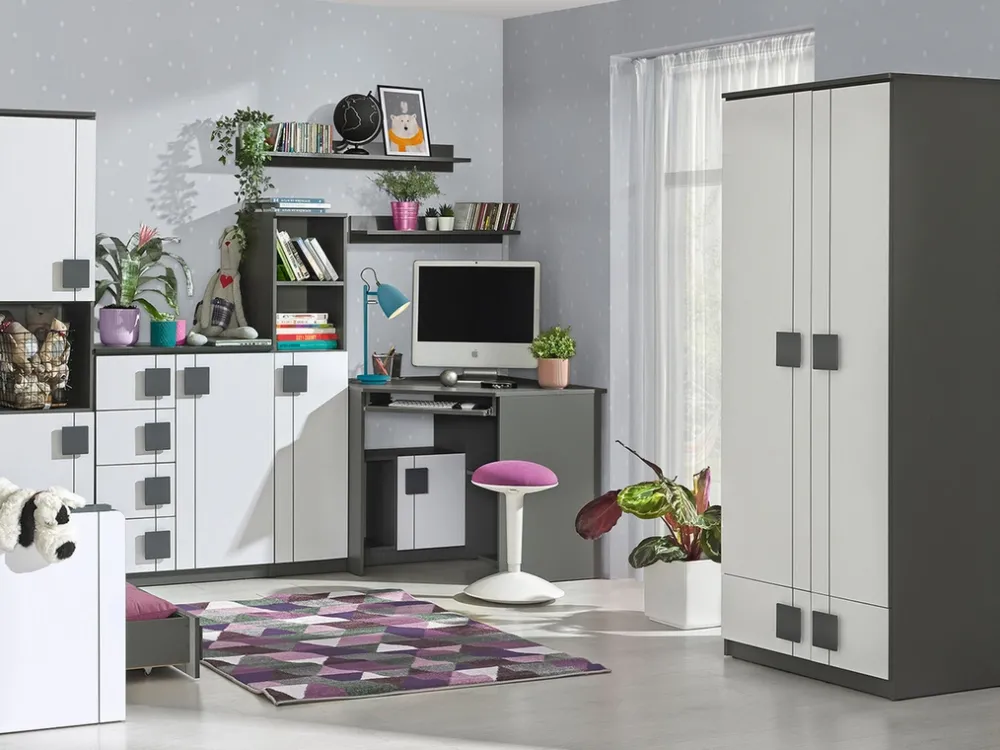- Nowoczesna szafa GROOVY do pokoju dziecięcego o szerokości 80 cm. Występuje w jednym wybarwieniu łączącym dwa kolory: antracyt i biały brylantowy. Wyposażona w dwie szuflady, trzy półki oraz drążek na ubrania. Wykonana z płyty laminowanej 16 mm.