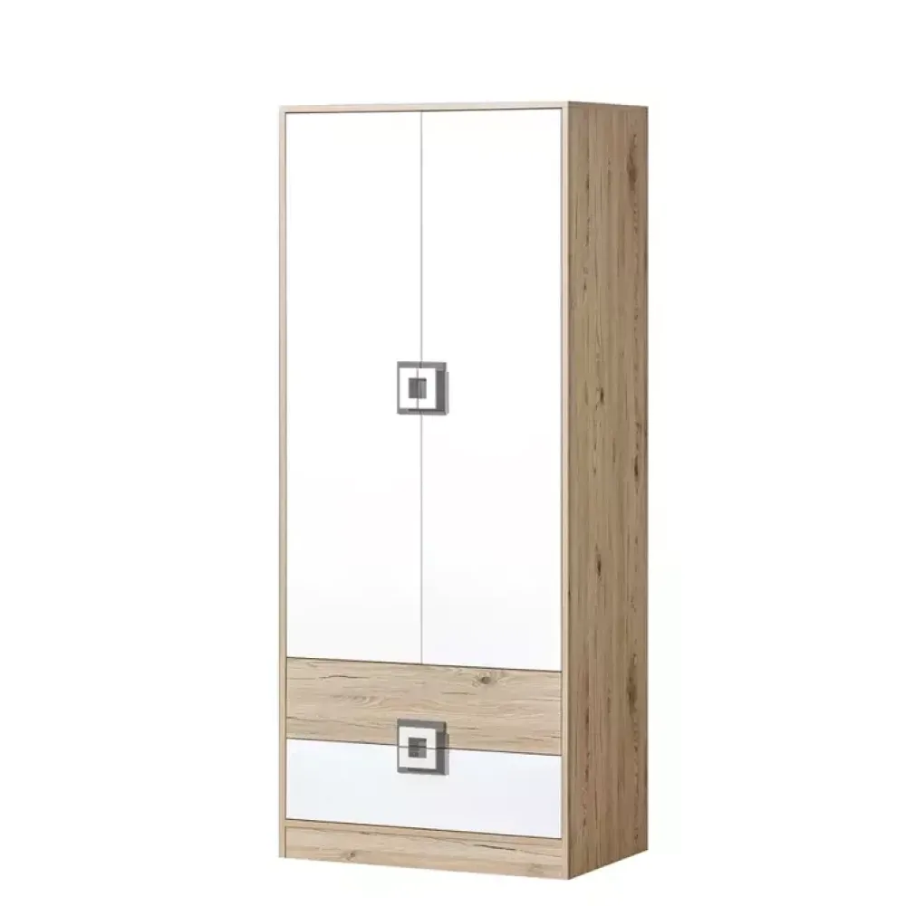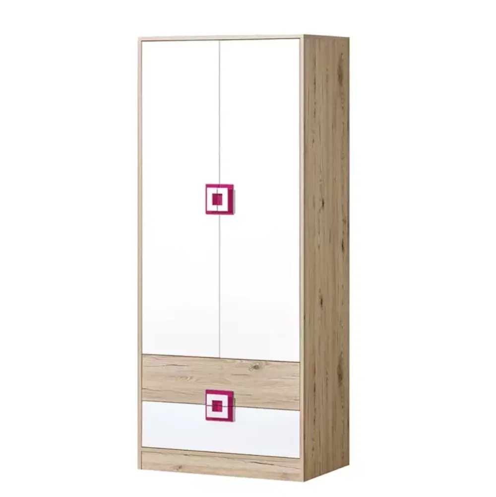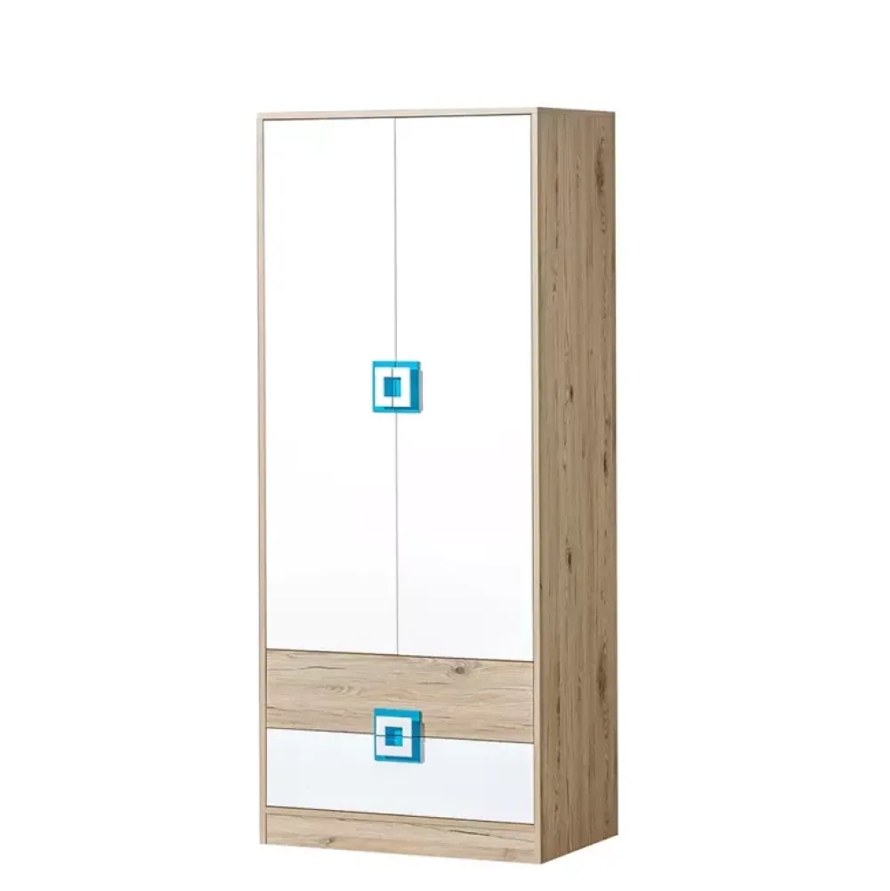 - Dziecięca szafa z szufladami z kolekcji NICO z dwiema pojemnymi szufladami na dole oraz parą drzwi, za którą znajduje się obszerna przestrzeń na wieszaki razem z drążkiem. Uchwyty szafy dostępne w czterech wariantach kolorystycznych.