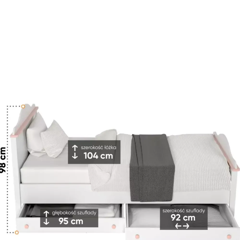 Łóżko wyposażone w drewniany stelaż oraz materac ze sprężynami typu bonell oraz szufladą to wygodne miejsce do spania, a szuflada pod łóżkiem zapewnia dodatkową przestrzeń do przechowywania pościeli lub innych rzeczy.