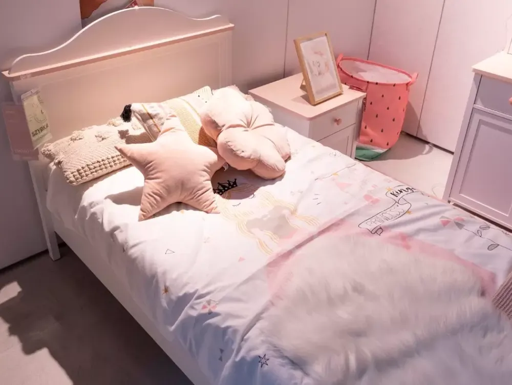 - Łóżko zostało wyposażone w drewniany stelaż oraz materac ze sprężynami typu bonell.