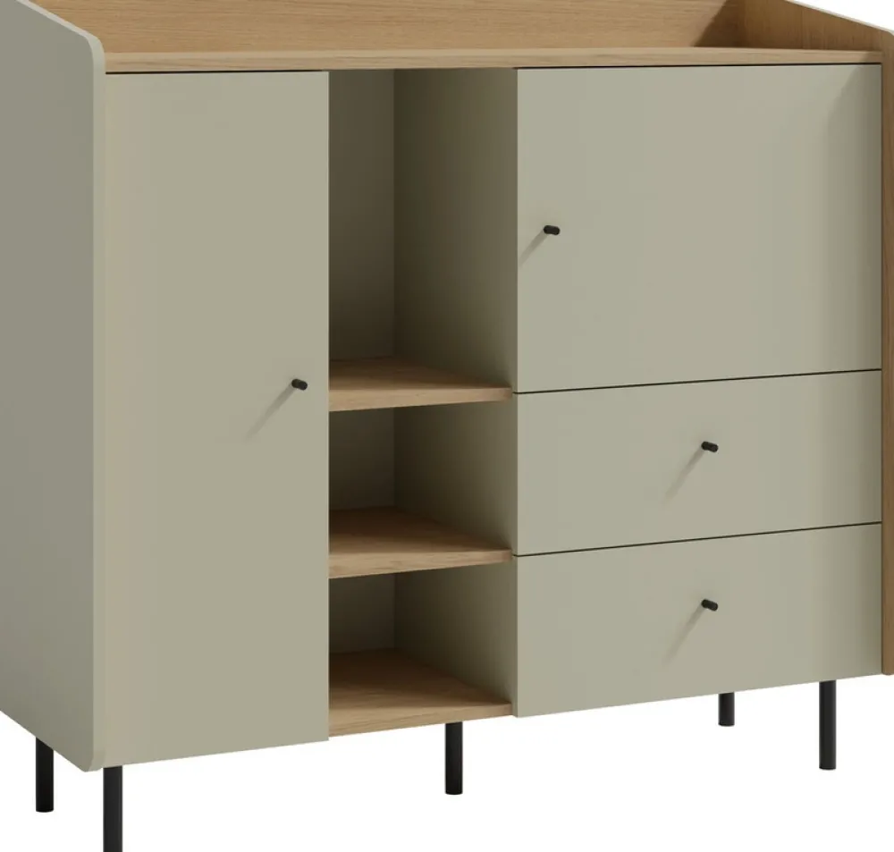 Nowoczesna komoda na nóżkach ALDENO to prawdziwa mistrzyni organizacji. Wyposażona w dwie przestronne szuflady na prowadnicach rolkowych, zapewnia łatwy dostęp do drobnych rzeczy, takich jak ubrania, akcesoria czy przybory szkolne. Za drzwiami komody znajdują się półki, które pomogą uporządkować wszystkie skarby Twojego nastolatka – od książek po zabawki. Środkowa część komody oferuje trzy otwarte półki, na których można wyeksponować ulubione książki, zdjęcia, pamiątki czy inne dekoracje, które nadadzą pokojowi osobistego charakteru.
