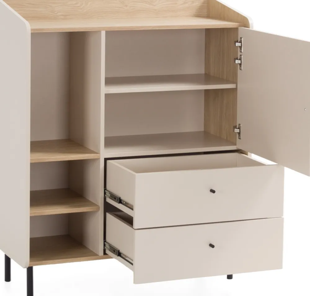 - Niska komoda z szufladami ALDENO o szerokości 95 cm oparta została na wysokich nóżkach. Nowoczesna komoda w kolorze beż piaskowy posiada również drzwi, za którymi kryją się dwie półki. Komoda z szufladami posiada także trzy otwarte półki.