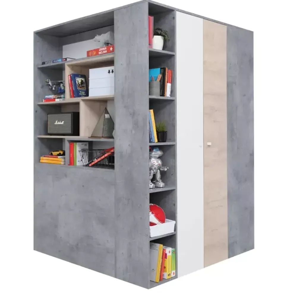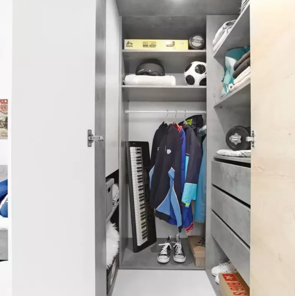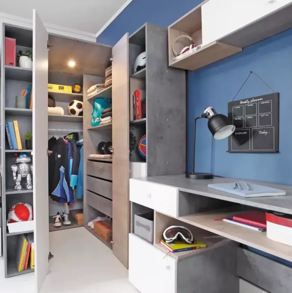 Zamknięta dwudrzwiowa szafa w stylu garderoby to świetne rozwiązanie do pokoju młodzieżowego. Wnętrze zostało tak przemyślane, aby znalazło się w nim miejsce na wszystko. Szafę wyposażono w m.in. szeroki drążek na wieszaki, trzy duże szuflady, ponad 5 półek, a to tylko we wnętrzu, z zewnątrz natomiast do dyspozycji mamy z jednej strony kilka kolejnych półek, a jedną ze ścian zaaranżowano na niewielki regał. Garderoba dostępna jest w dwóch wariantach kolorystycznych.