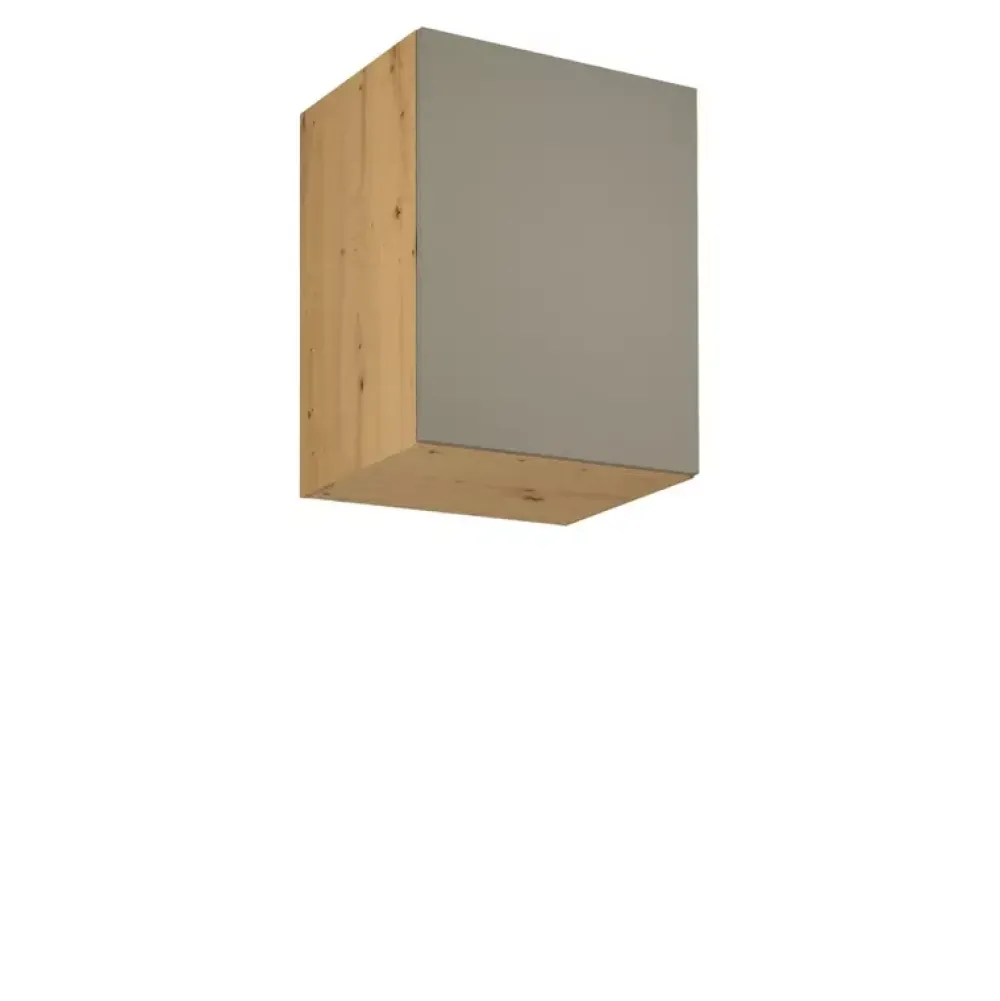 - Górna szafka kuchenna ma korpus w kolorze dąb artisan i trzy kolory frontów do wyboru w konfiguratorze „Dopasuj i kup”.