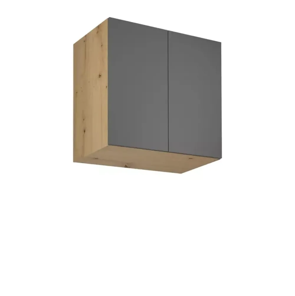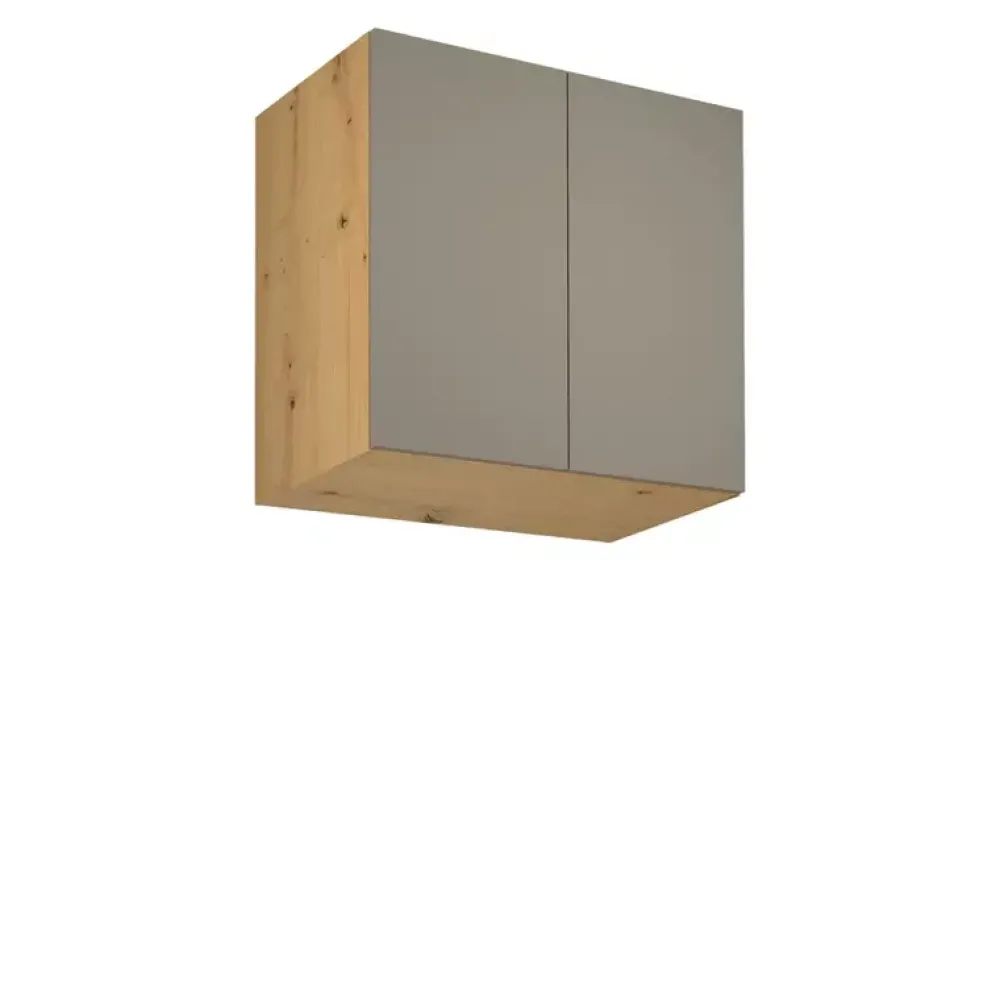 - Górna szafka kuchenna ma korpus w kolorze dąb artisan i trzy kolory frontów do wyboru w konfiguratorze „Dopasuj i kup”.