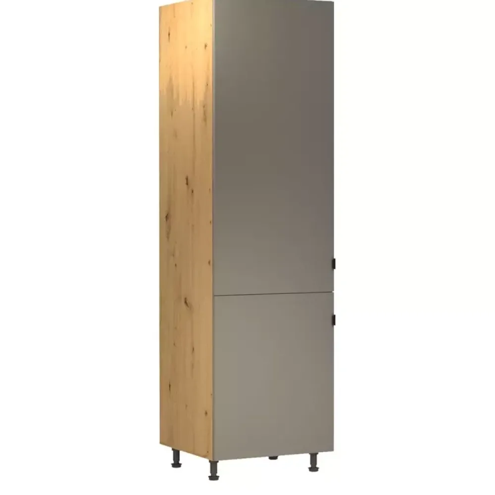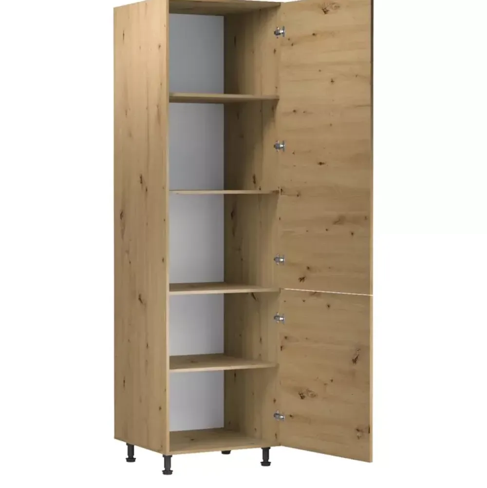 - Wysoka szafka stojąca ma 60 cm szerokości i wyposażono ją w cztery półki. Słupek kuchenny ma korpus w kolorze dąb artisan i trzy kolory frontów do wyboru w konfiguratorze „Dopasuj i kup”.