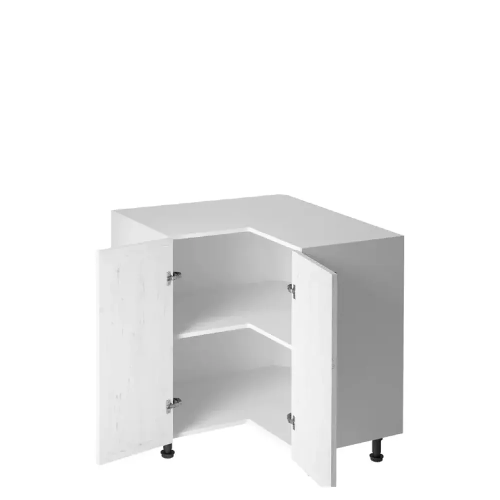 - Szafka kuchenna narożna PARCELIO posiada 79 cm szerokości, oraz drzwi umieszczone na zawiasach z cichym domykiem, za którymi znajduje się półka. Dodatkowo szafka posiada metalowe uchwyty w czarnym kolorze.