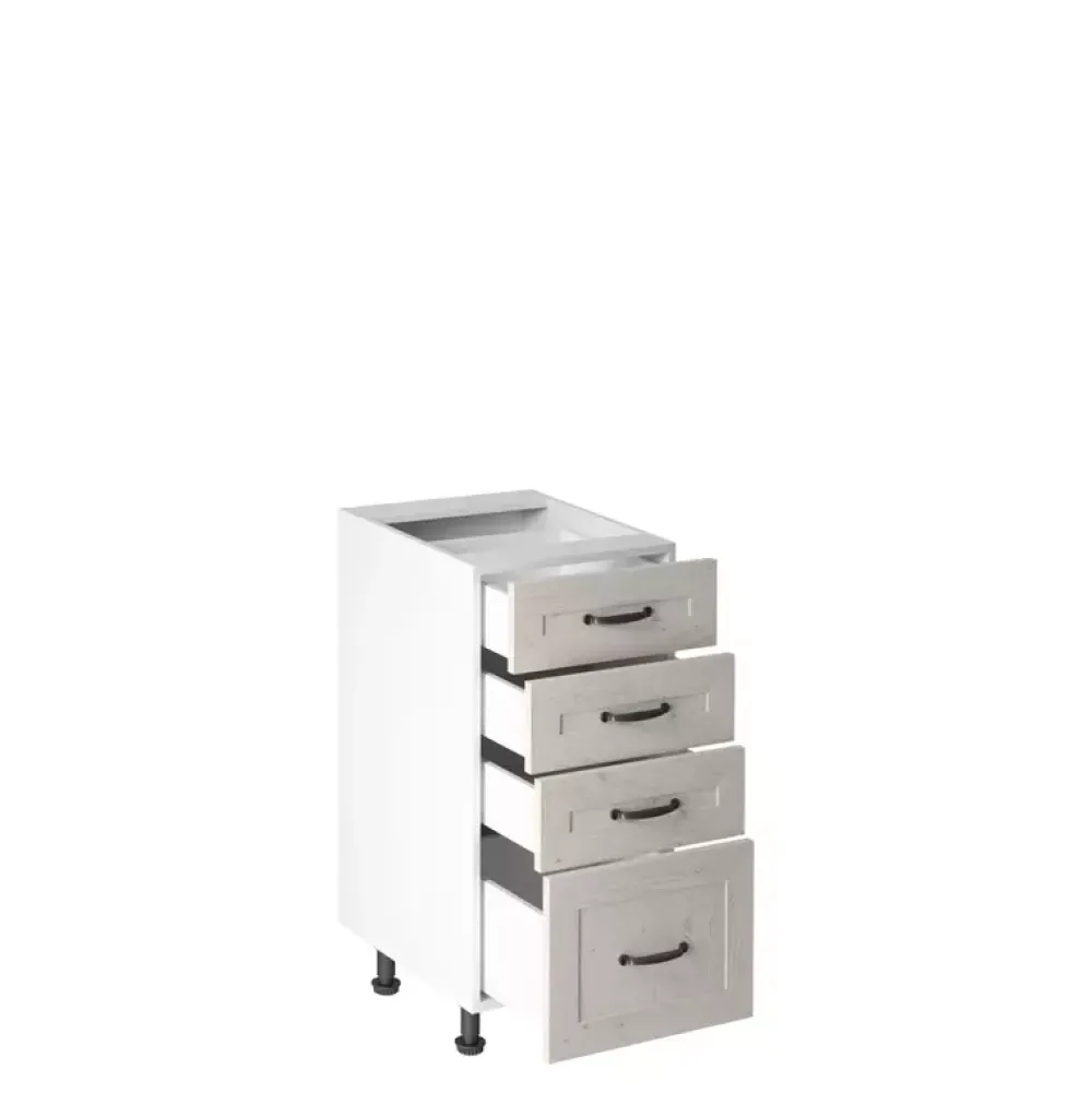 Szafka kuchenna ROZANELI posiada 40 cm szerokości w skład których wchodzą cztery szuflady umieszczone na prowadnicach kulkowych, w których możesz znaleźć miejsce na rozmaite akcesoria kuchenne. Szafka dzięki wykonaniu w stonowanej stylistyce uczyni twoją kuchnię ciepłą oraz bardzo przytulną. Dodatkowo szafka posiada solidne uchwyty wykonane z metalu w czarnym kolorze.