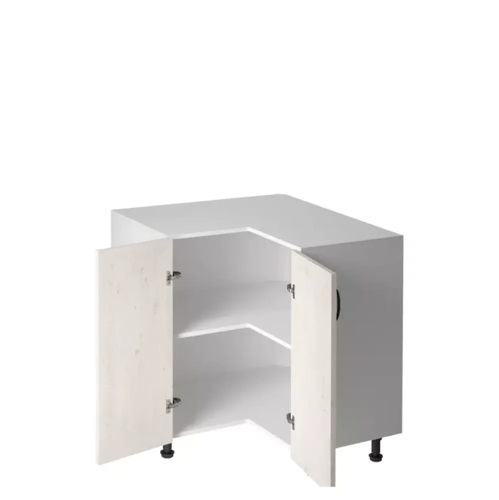 - Szafka kuchenna narożna ROZANELI została wyposażona w parę drzwi umieszczonych na regulowanych zawiasach puszkowych z cichym domykiem za którymi znajduje się półka. Dodatkowo uchwyty szafki zostały wykonane z metalu w czarnym kolorze.