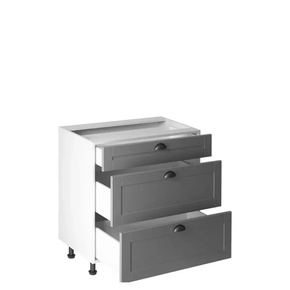 Szafka kuchenna LATERANI posiada 80 cm szerokości w skład których wchodzą trzy szuflady z metalowymi uchwytami w formie muszelek i kolorze czarnym, które umieszczono na prowadnicach z samodociągiem. Szuflady doskonale sprawdzą się do przechowywania rozmaitych akcesoriów oraz umieszczenia organizerów kuchennych. Dodatkowo nowoczesna stylistyka szafki sprawia, że doskonale sprawdza się we współczesnych aranżacjach kuchennych.