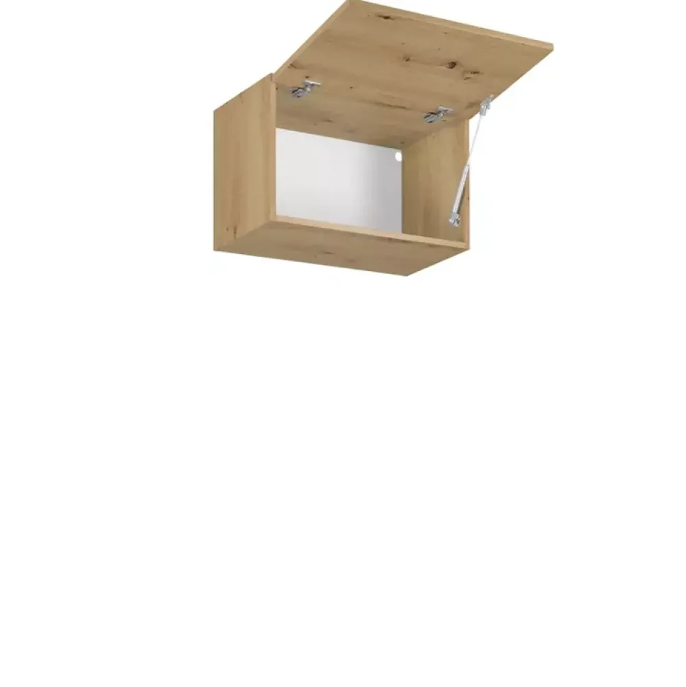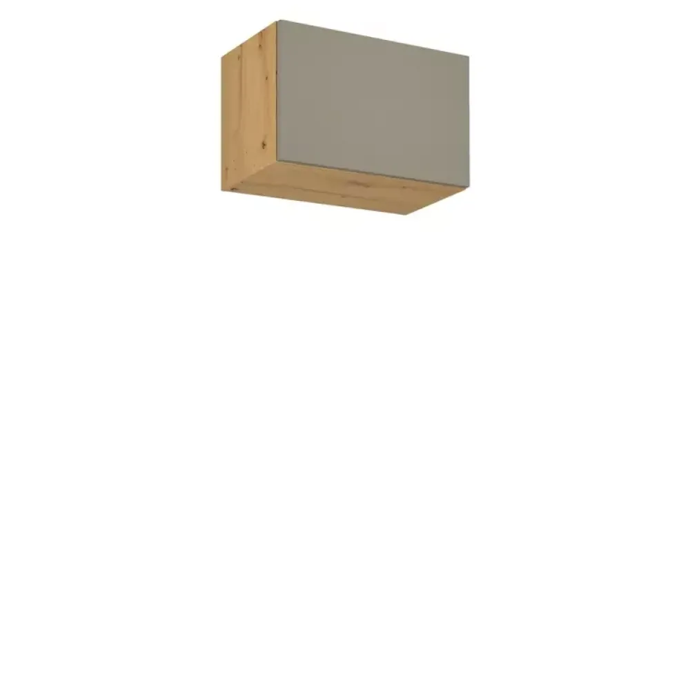 - Górna szafka kuchenna ma korpus w kolorze dąb artisan i trzy kolory frontów do wyboru w konfiguratorze „Dopasuj i kup”.