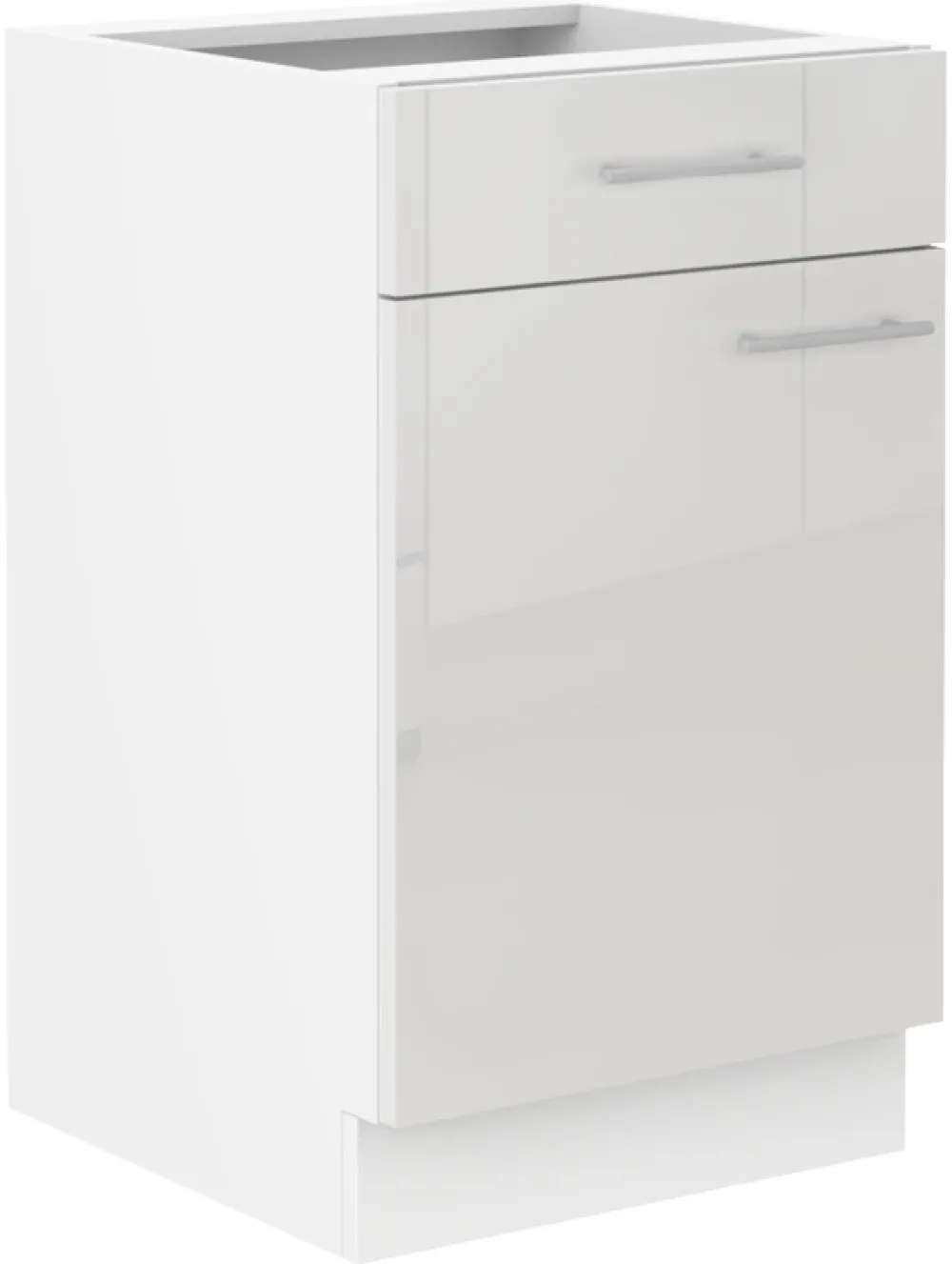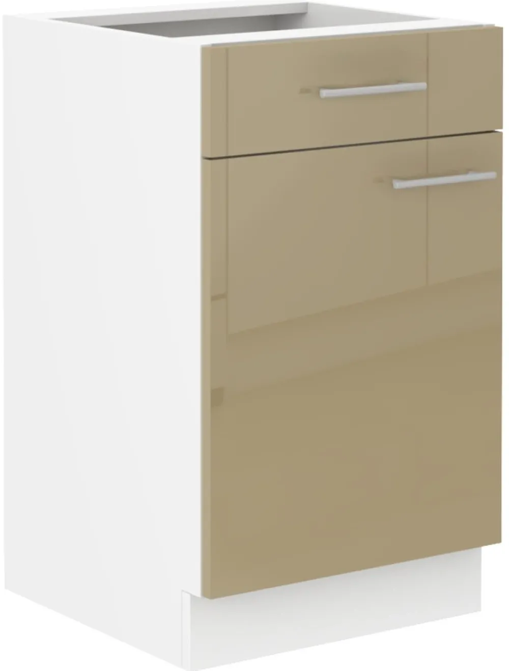 - Szafka kuchenna z szufladą o szerokości 50 cm LAURA. Fronty w wysokim połysku wykonane są z płyty MDF. Szafka kuchenna posiada funkcję cichego domyku, a także praktyczną półkę za drzwiami. Metalowe uchwyty. Szafka dostępna jest w trzech kolorach.
