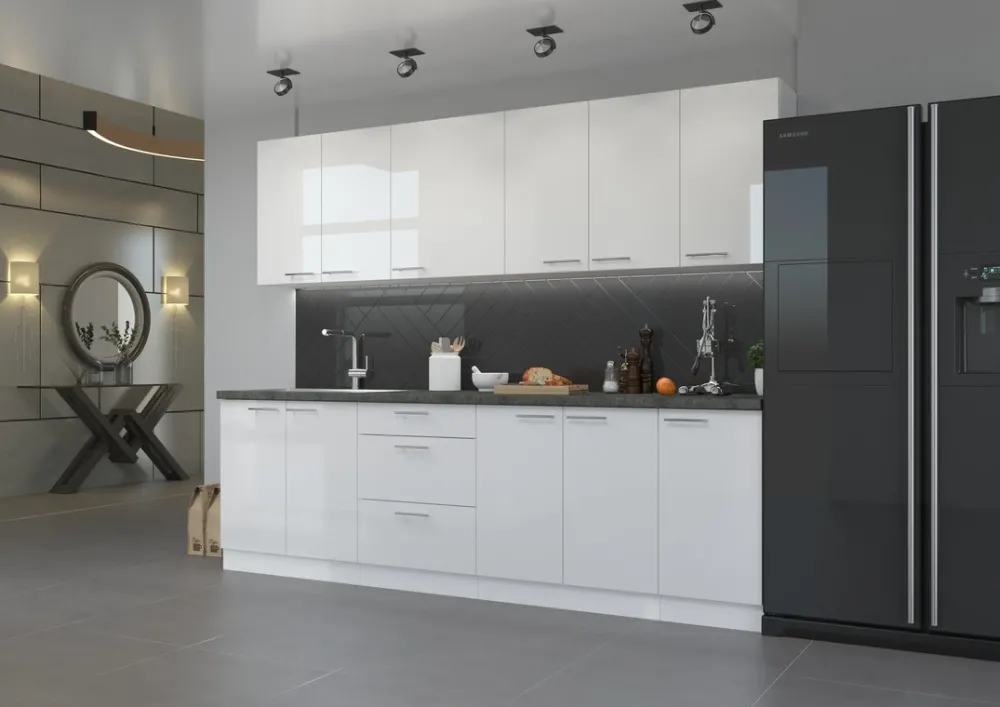 - Front szafki kuchennej wykonany jest z płyty MDF w trzech kolorach wykończonych na wysoki połysk: biały, szary oraz cappucino.