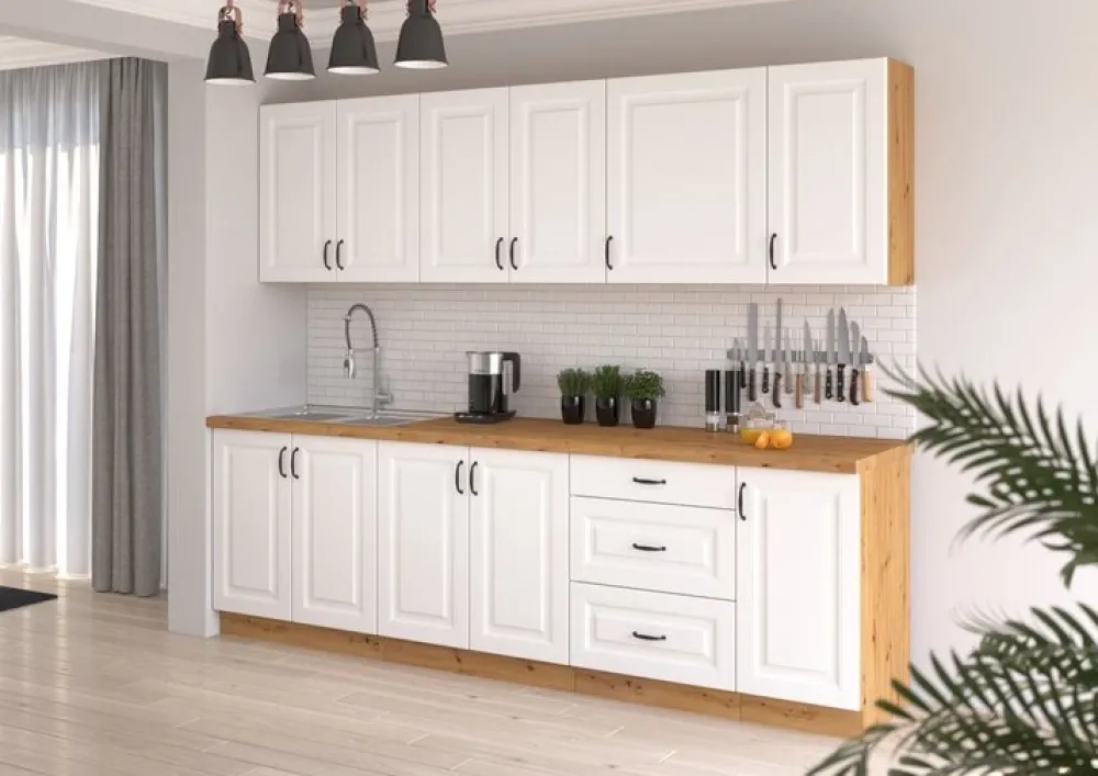 Zestaw mebli kuchennych o łącznej szerokości 260 cm. W skład zestawu wchodzą kuchenne szafki wiszące i szafki stojące, wykonane z bardzo dobrej jakości materiałów. Zawiasy, w jakie wyposażono te szafki kuchenne posiadają system cichego domykania, co gwarantuje delikatne zamykanie i otwieranie drzwi. Szafki stojące opierają się na cokołach w kolorze korpusu. Każda szafka ma oddzielny cokół. Uchylne szafki stojące, poza szafką pod zlew mają po jednej półce wewnątrz, natomiast szafki wiszące mają po dwie półki. Szafki posiadają czarne, metalowe uchwyty, jednak możesz zastosować w nich inne, ponieważ otwory wiercone są nieprzelotowo. W skład zestawu nie wchodzi blat kuchenny.