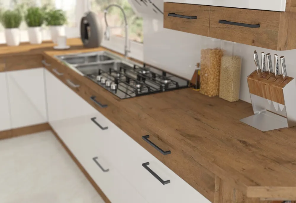 Blatem dedykowanym dla serii VIKI jest blat w kolorze Dąb Lancelot o grubości 28 mm
