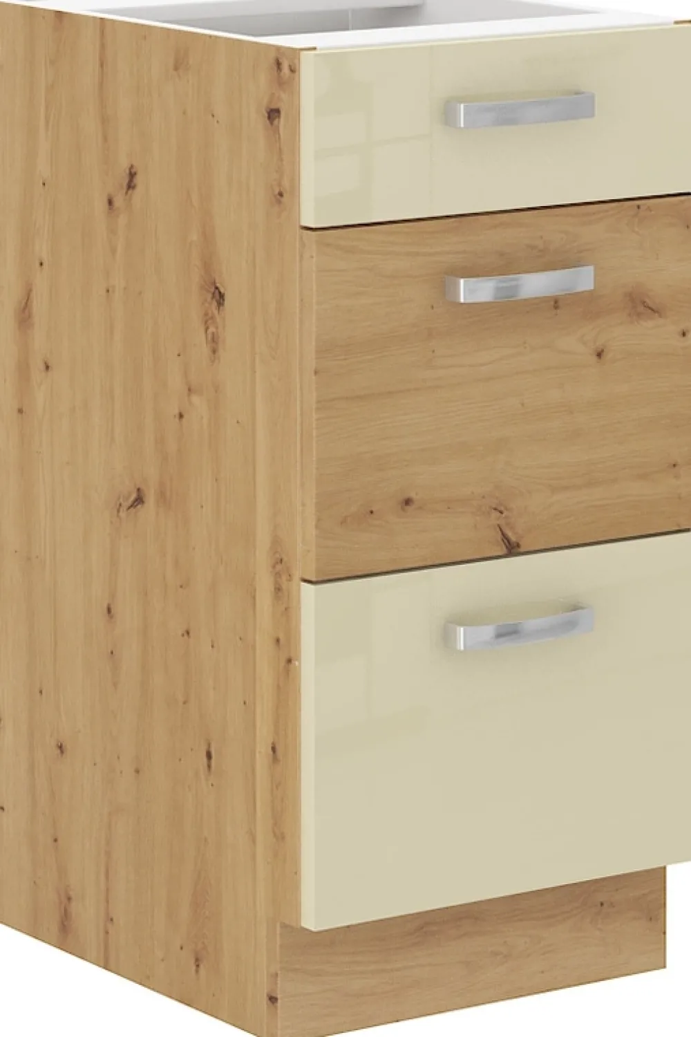 - Szafka kuchenna stojąca z trzema szufladami PREMIUM BOX o szerokości 40 cm. Korpus szafki wykonany został z płyty laminowanej 16 mm. Szafka kuchenna w kolorze dąb artisan/ kremowy połysk. Front wykonany z płyty MDF 16mm. Uchwyty metalowe.