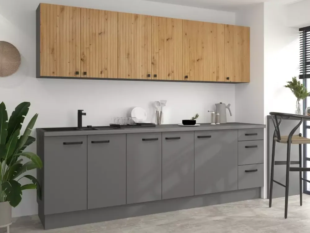 Z kolei cztery stojące szafki z serii NEPO, w odcieniu eleganckiego antracytu, oferują przestronne i praktyczne rozwiązanie do przechowywania wszystkich niezbędnych akcesoriów kuchennych. Ich proste formy podkreślają współczesny charakter kuchni, a jednocześnie doskonale łączą się z ciepłym odcieniem dąb artisan.