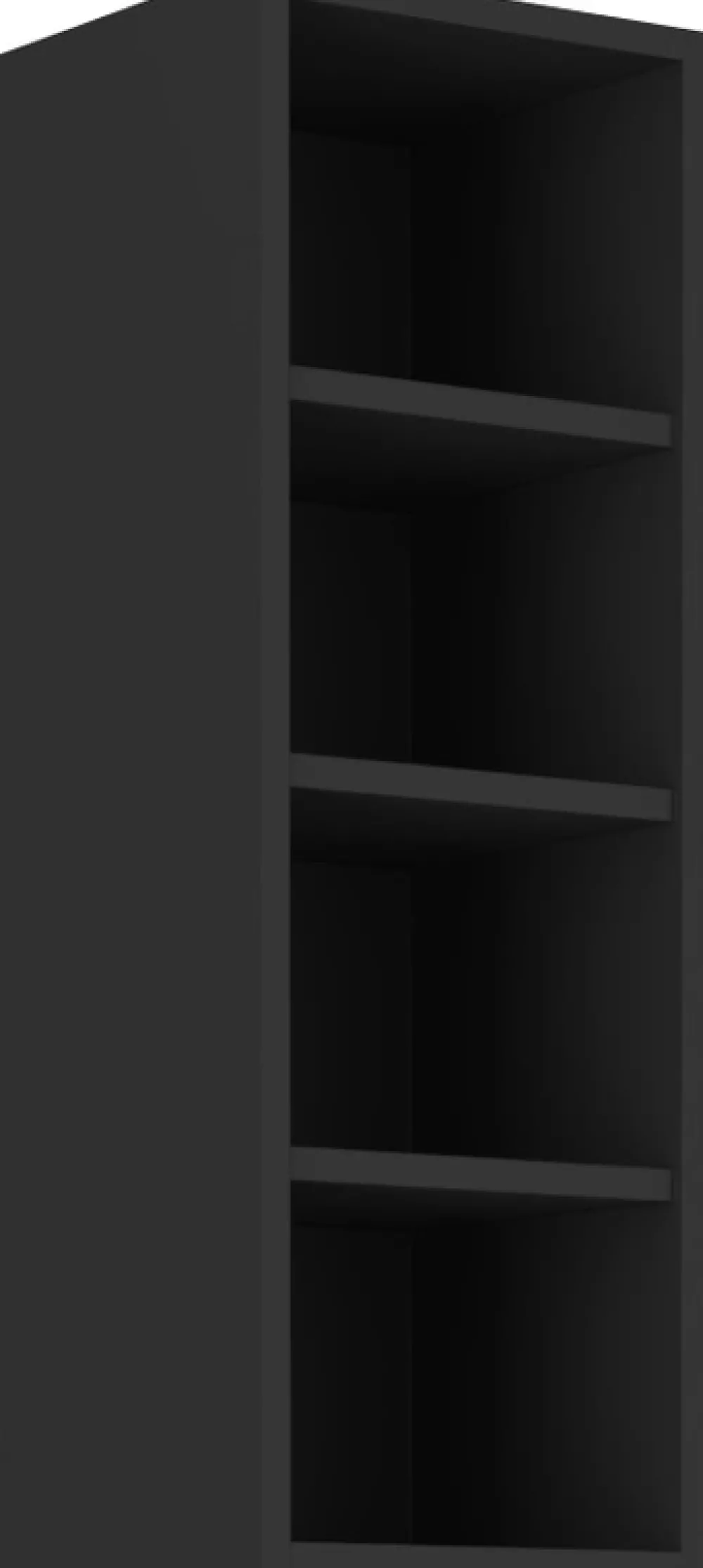 Nasza otwarta wisząca szafka kuchenna w głębokim, matowym odcieniu czerni z pewnością będzie wyraźnym akcentem Twojej kuchni, a także świetnym miejscem na różne kuchenne akcesoria, dodatki i dekoracje.