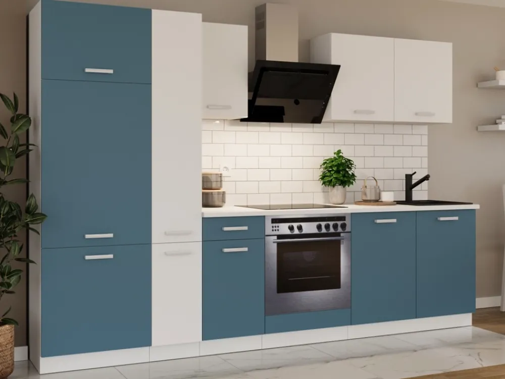 Unikalny kolor skaggerak podkreśla nowoczesny charakter mebli kuchennych, dodając świeżości. Natomiast wysokiej jakości płyta laminowana, z której zostały wykonane meble, zapewnia trwałość oraz łatwość w czyszczeniu.