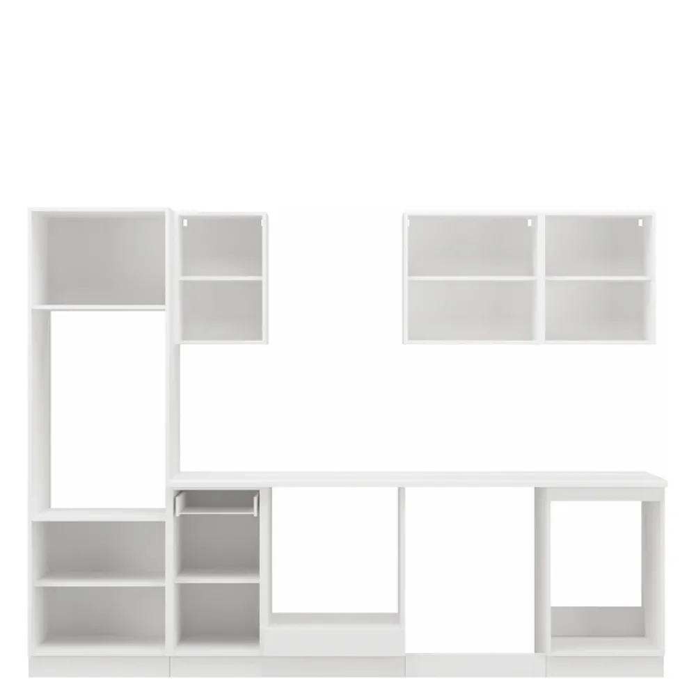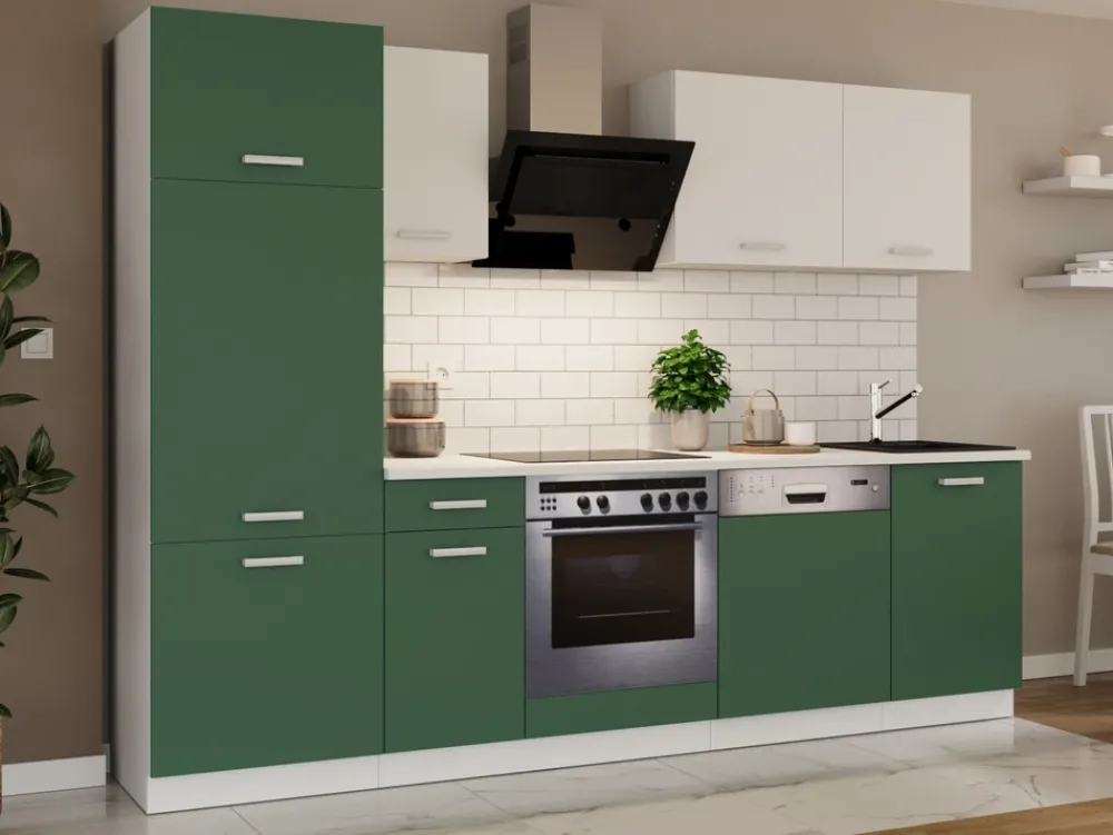 Zestaw składający się z ośmiu szafek umożliwia efektywne wykorzystanie przestrzeni kuchennej. Od szafki pod lodówkę, przez piekarnik, aż po zlewozmywak – każdy element ma swoje przeznaczenie. W zestawie miejsce znalazła również szafka pod zabudowę zmywarki ze specjalnym frontem, którym zamaskujesz urządzenie, poprawiając estetykę.