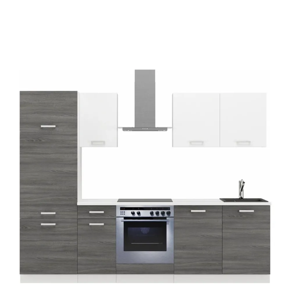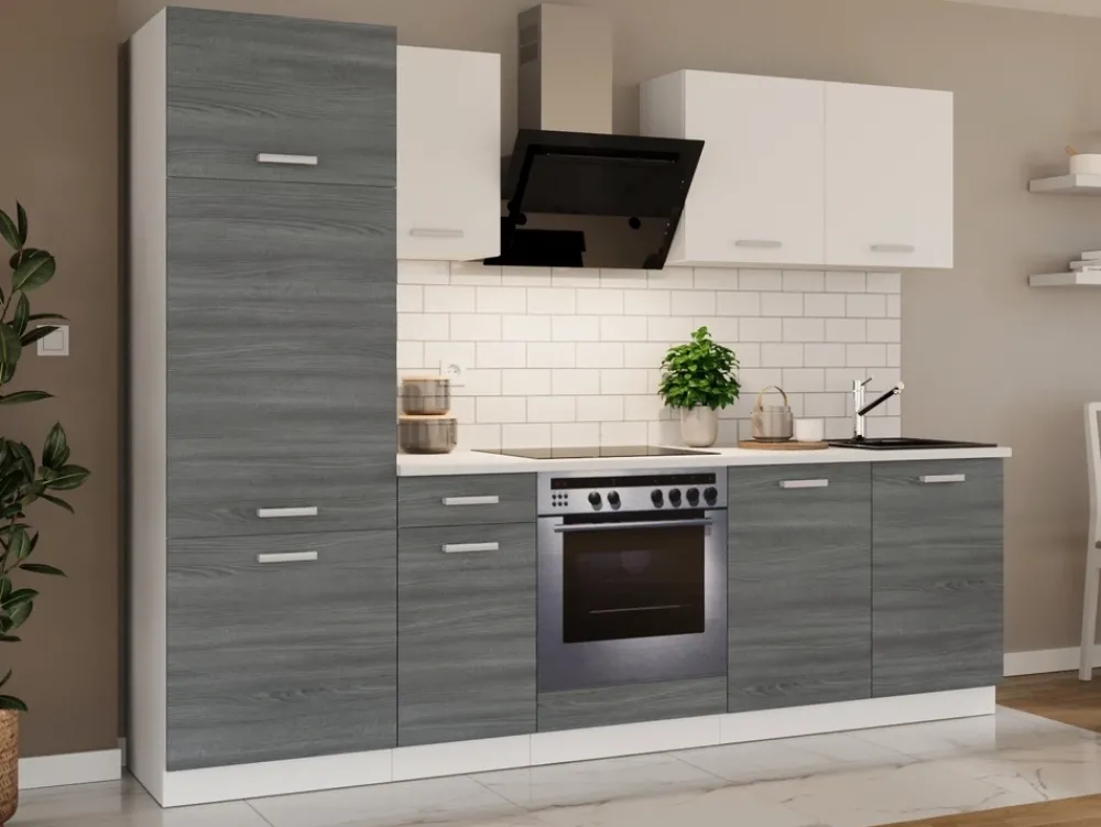 W skład zestawu wchodzi aż sześć różnorodnych szafek, które dostosowane są do podstawowych urządzeń kuchennych. Dzięki temu masz gwarancję, że Twoja lodówka i piekarnik idealnie wkomponują się w przestrzeń, tworząc spójny i uporządkowany wygląd.