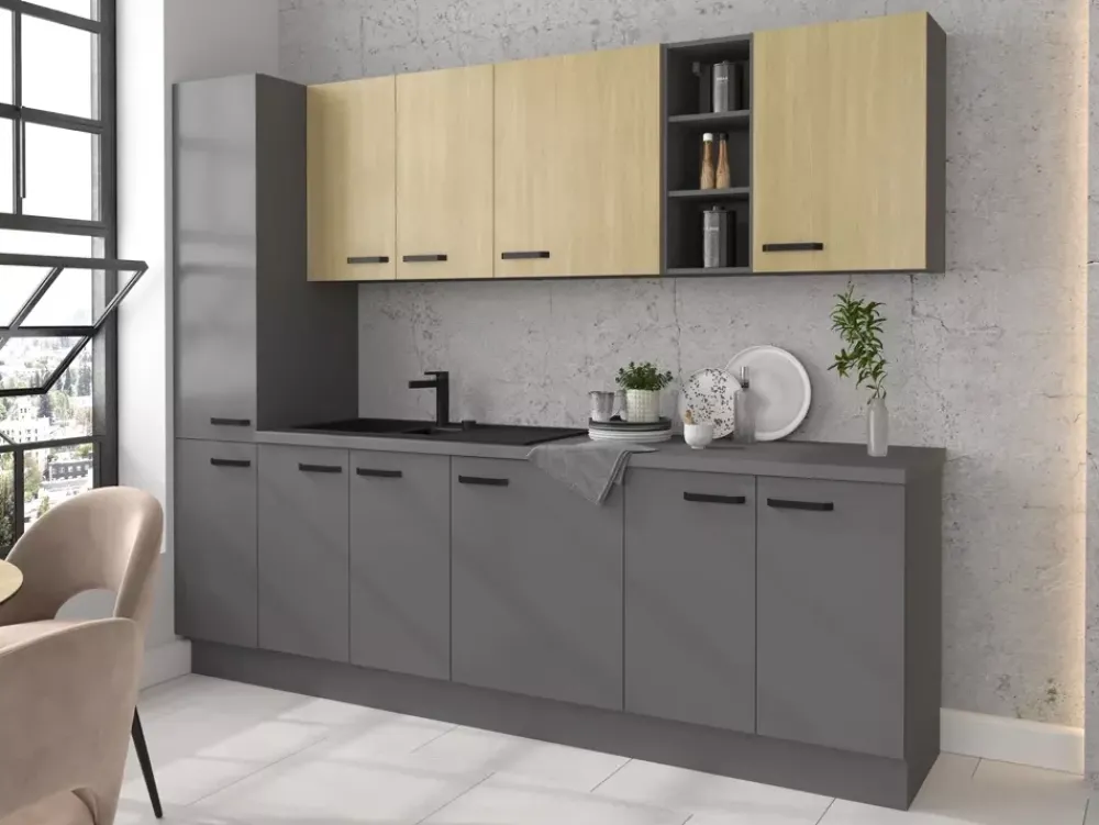 Kolekcja SUNSHINE daje nam trzy wiszące szafki, ozdobione wyjątkowym wzorem jodełki na frontach, który dodaje charakteru i ciepła. Ich delikatny urok doskonale kontrastuje z surowym, nowoczesnym wyglądem dolnych szafek z kolekcji NEPO, wykonanych z antracytu. Te solidne, eleganckie dolne szafki nie tylko podkreślają styl, ale także oferują miejsce na przyprawy, małe akcesoria, środki czystości oraz wystarczająco dużo miejsca na garnki, patelnie i inne niezbędne w kuchni przedmioty.